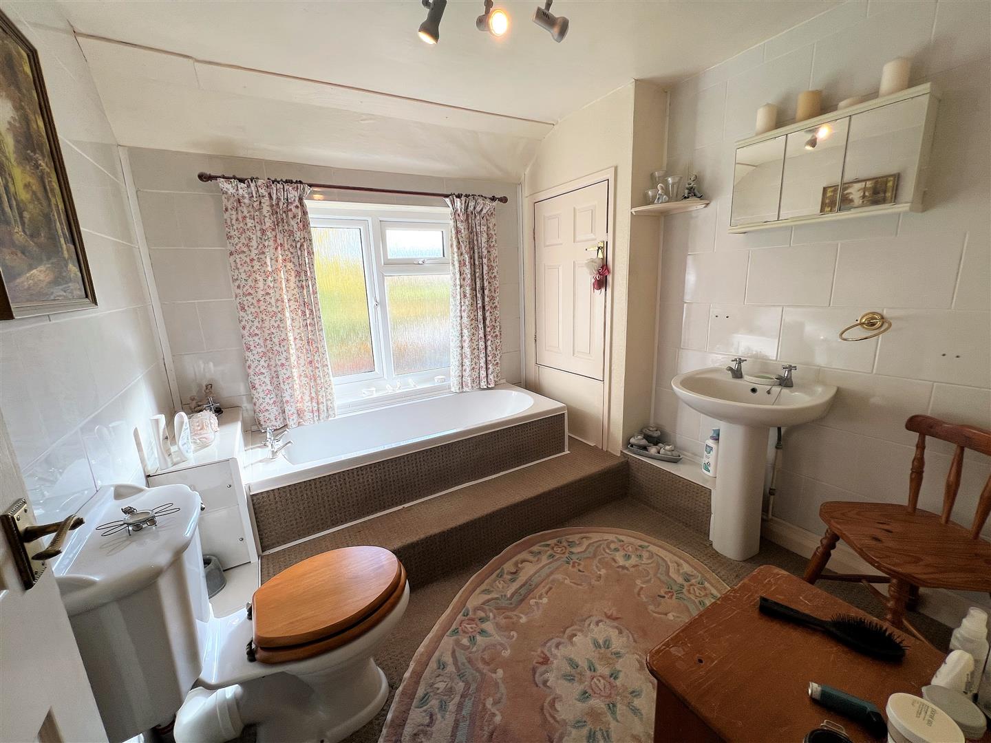 Bathroom - 2.49m x 2.41m (8'2 x 7'11) - White suite comprising of modern panelled bath, close coupled WC, pedestal wash hand basin, single radiator, built-in cupboard over the stairs, front aspect frosted window.
