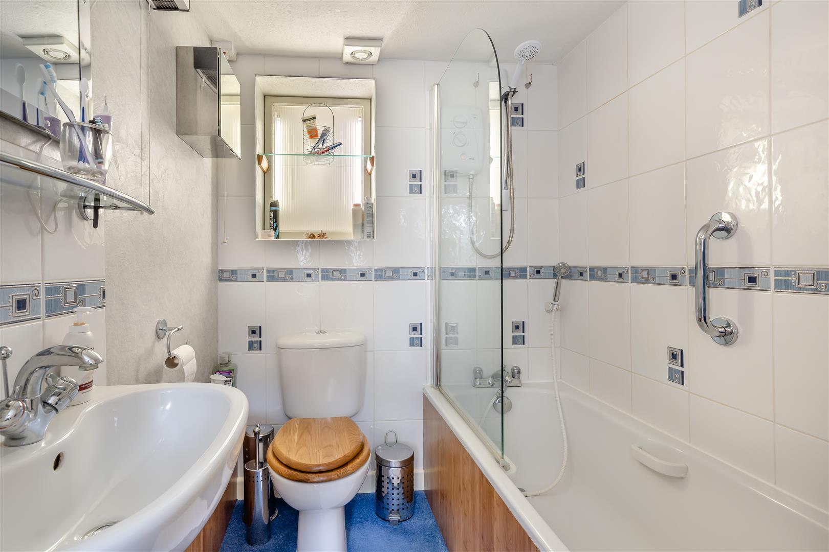 Bathroom - White suite comprising modern panelled bath with electric shower over, tiled surround, close coupled WC, pedestal wash hand basin with tiled splashback, heated towel rail, wall mounted electric convector heater.
