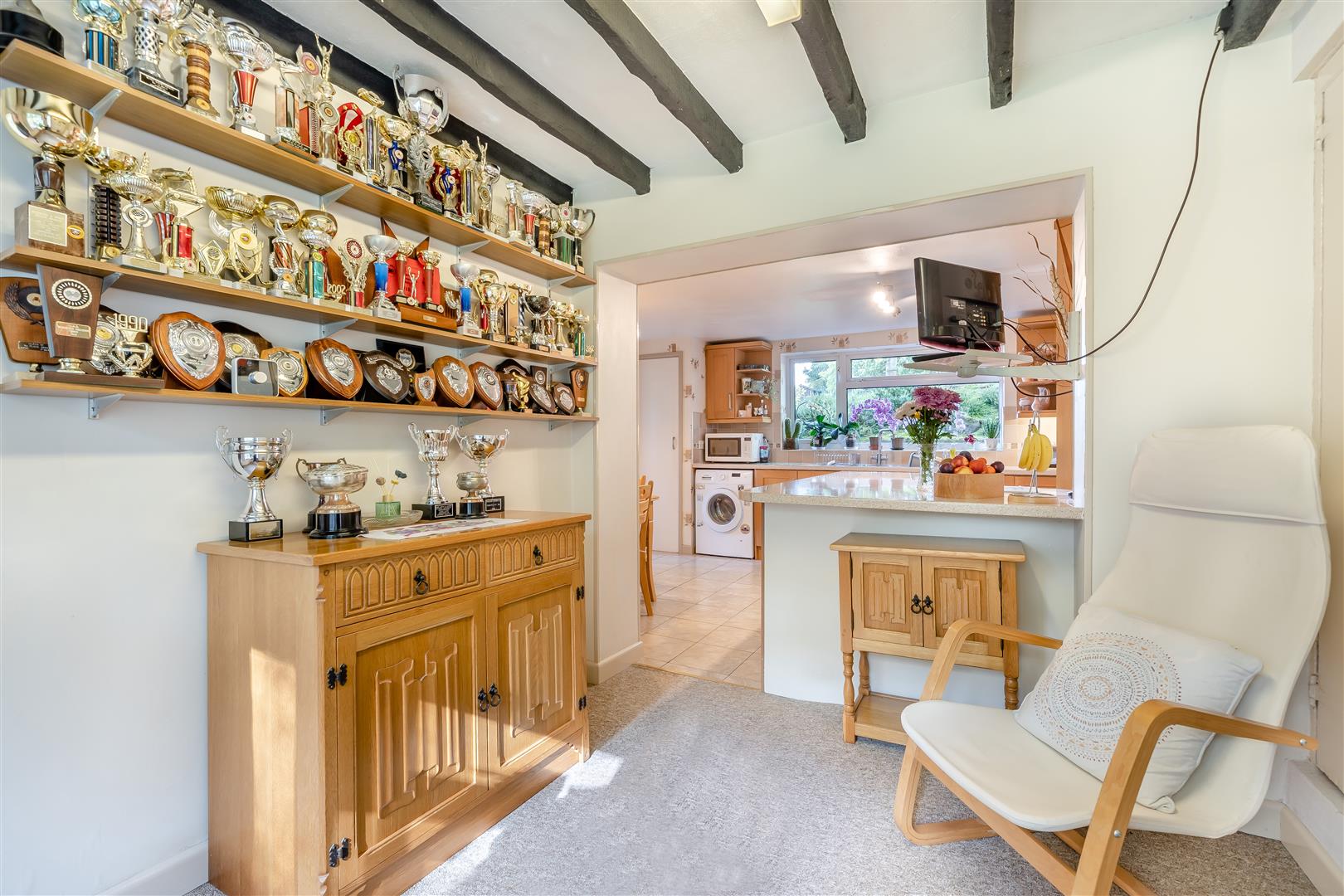 Dining Area - 2.95m x 2.46m (9'8 x 8'1) - Built-in cupboard with shelving, ceiling beams, front aspect window overlooking the gardens and onto mature trees.