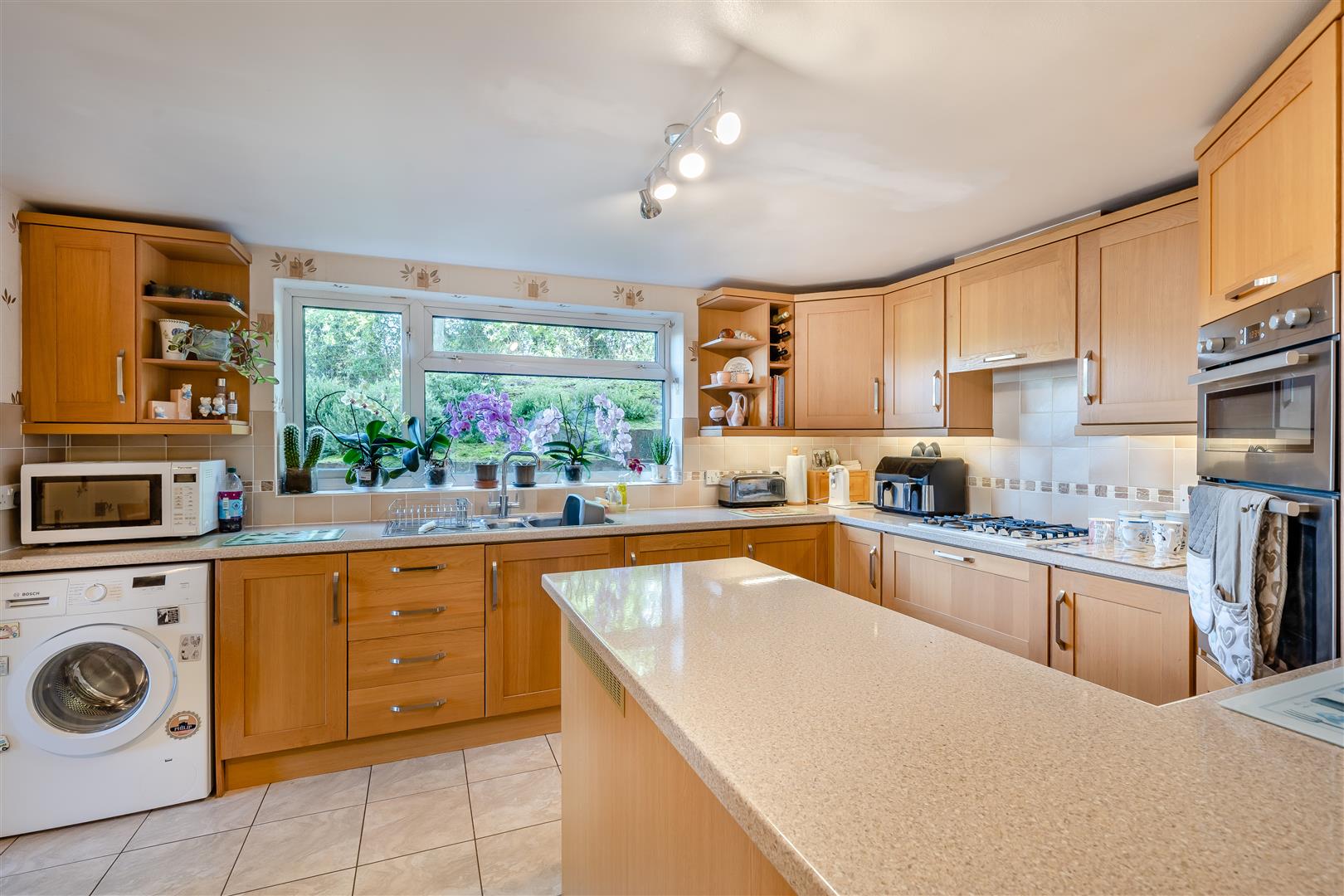 Kitchen / Breakfast Room - 4.70m x 3.18m (15'5 x 10'5) - One and a half bowl single drainer sink unit with mixer tap, cupboards under, range of base and wall mounted units, integrated electric double oven, cupboard above and below, four ring gas hob, cooker hood above, built-in pantry cupboard with shelving, breakfast bar, plumbing for washing machine, double radiator, tiled flooring, rear aspect window with a private outlook onto open fields. Opening through to: