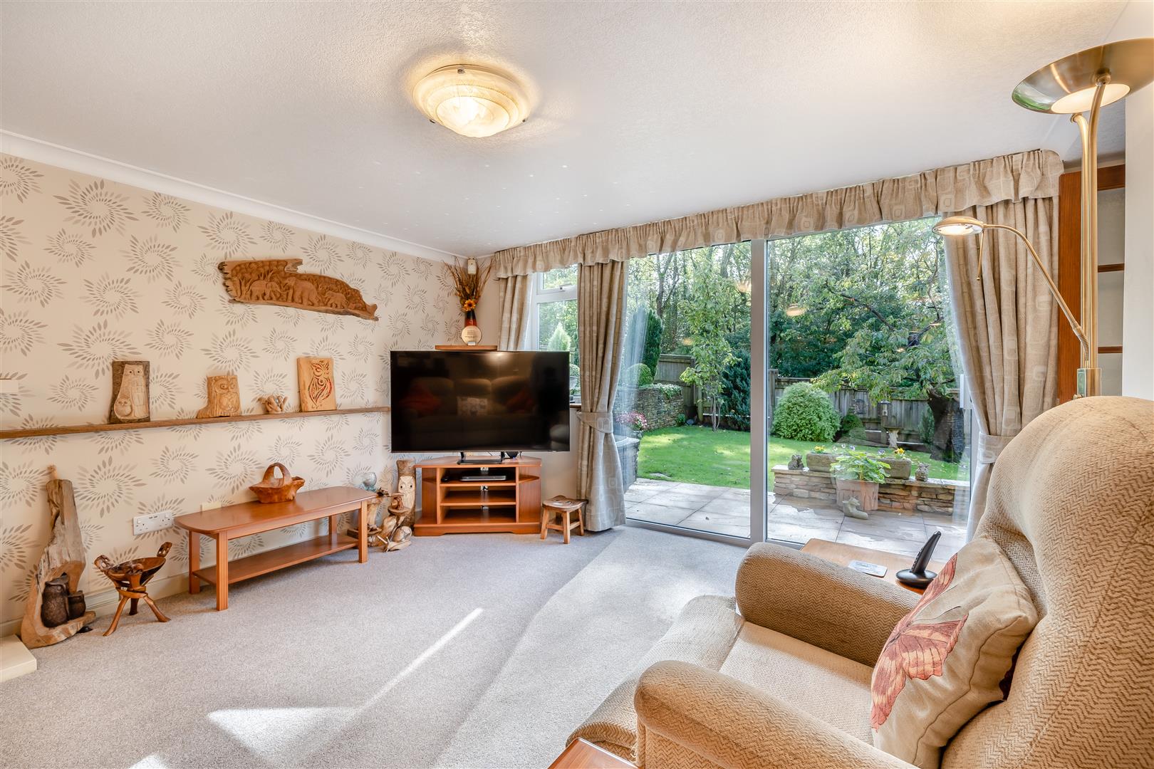 Lounge - 6.60m x 3.63m (21'8 x 11'11) - Stone fireplace with raised hearth, inset gas fire, radiator, coving, front aspect window, double glazed sliding patio doors through to the front with a private outlook onto the gardens and mature trees.