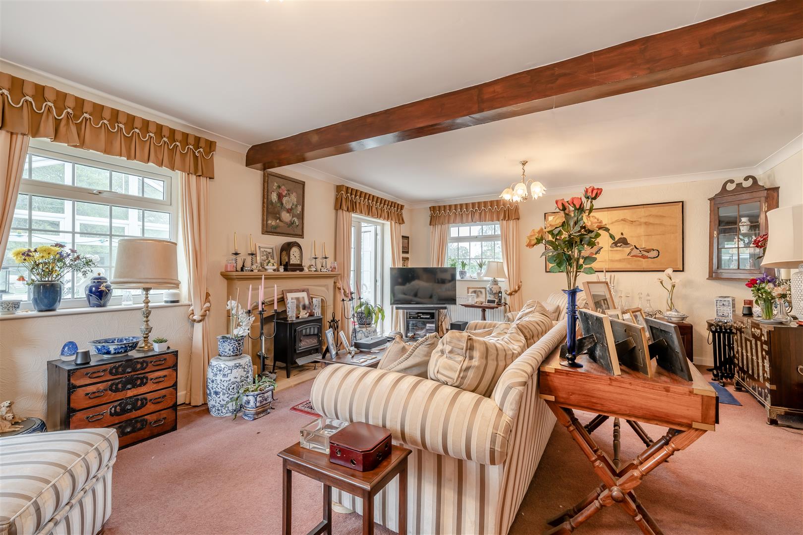 Lounge - 6.76m x 4.57m (22'2 x 15') - Feature fireplace with inset electric effect wood burning stove, three double radiators, side and rear aspect windows with a private outlook over the gardens, fully glazed UPVC doors through to: