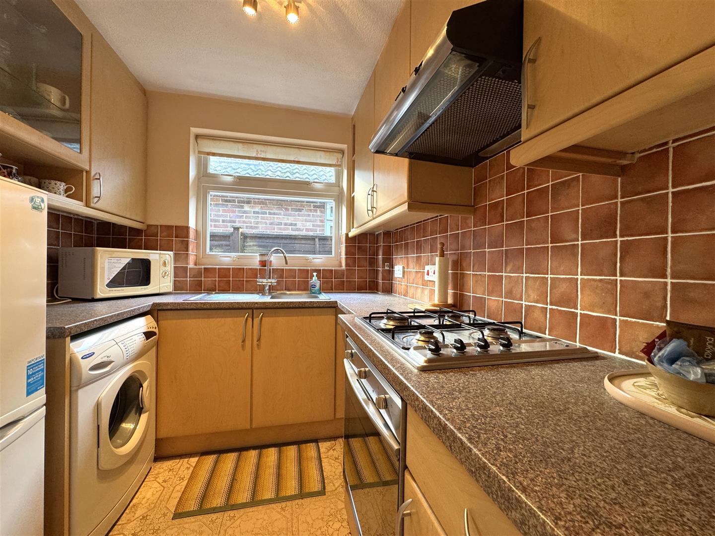 Kitchen - 2.44m x 2.13m (8'0 x 7'0) - A range of modern base and wall mounted units with laminated worktops and tiled splasbhacks, single drainer stainless steel sink unit, Ideal Mexico gas-fired boiler, SMEG oven with four ring gas hob and extractor fan over, plumbing for washing machine, space for fridge / freezer, side aspect window.