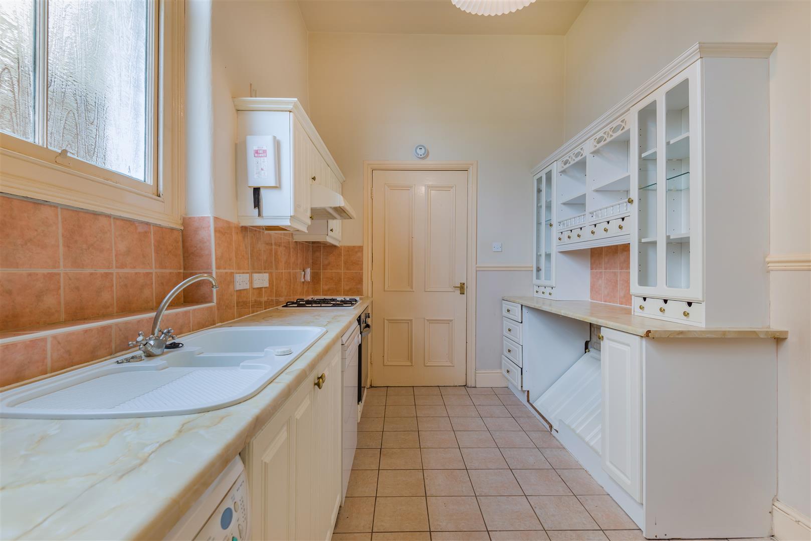 Kitchen - 4.01m x 2.59m (13'02 x 8'06) - One and a half bowl single drainer sink unit with mixer tap over, rolled edge worktops, range of base and wall mounted units, tiled surround, power points, four-ring gas hob, electric oven beneath, filter hood above, space for dishwasher, automatic washing machine, central heating thermostat controls, high ceilings, dado rail, single radiator, tiled flooring, ceiling light, large side aspect partially obscure glazed sash window, three steps lead up to: