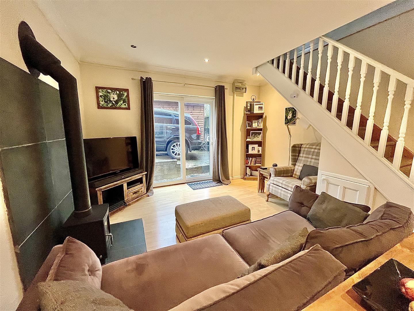 Open Plan Kitchen/Living Room - 6.40m x 3.86m (21'00 x 12'08) - Comprising a fully fitted modern kitchen with a range of wall and base level units with laminate worktops and an inset sink unit with drainer. Integral electric oven with induction hob and cooker hood over and a glass splashback. Space and plumbing for a washing machine and under counter fridge or freezer. The living area features a wood burning stove, tv point, internet point, laminate wood flooring, sliding patio doors to rear aspect leading to the driveway, front aspect window. Stairs lead to the first floor with small storage cupboard beneath.