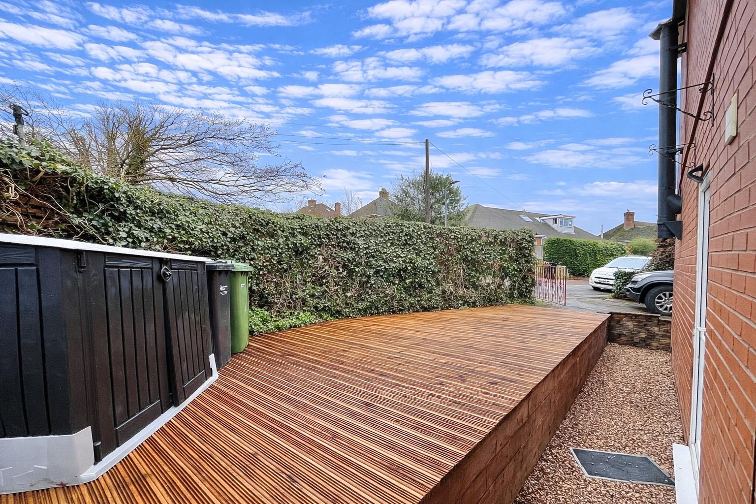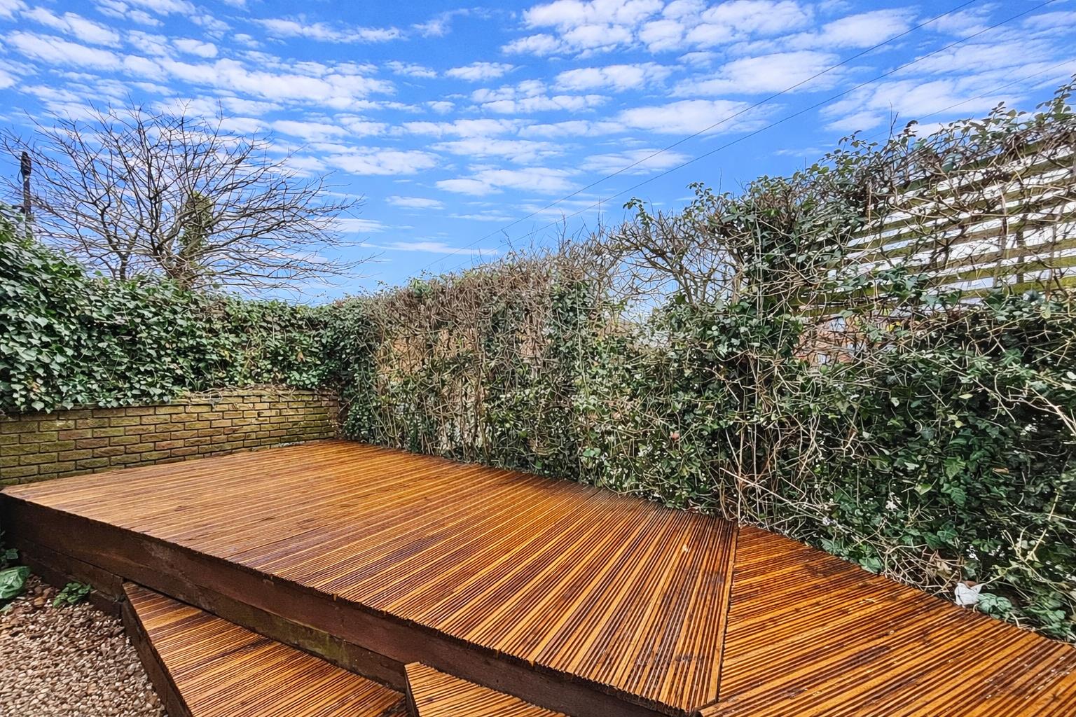 Outside - The property is situated in a corner plot with a mostly hedging surround providing privacy. The driveway parking for one vehicle is situated to the rear along with a timber cabin ideal as a potential home office/workshop. A path leads around the property with low maintenance garden laid to decking to the front and side.
