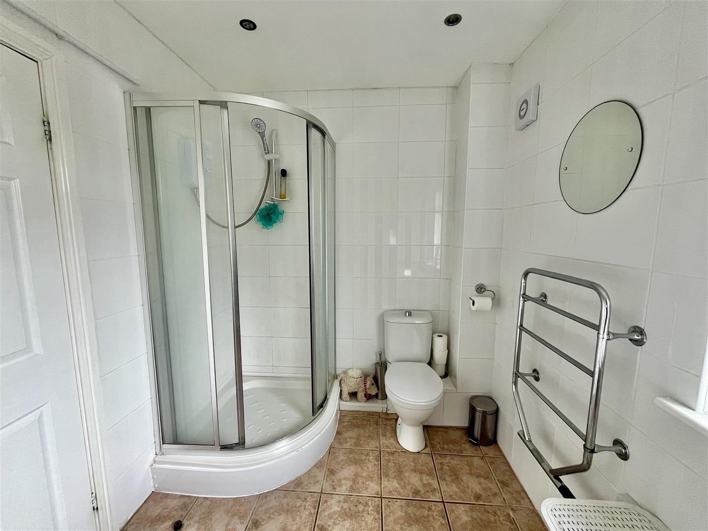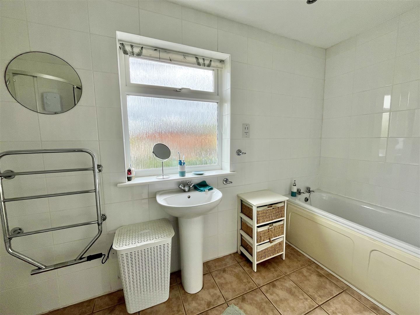Bathroom - 3.86m x 2.01m (12'08 x 6'07) - Modern four piece white suite comprising a bath with tiled surround, shower cubicle with electric shower, low level w.c, pedestal handbasin, electric heated towel rail, tiled floor, obscured front aspect window, airing cupboard with hot water immersion tank.