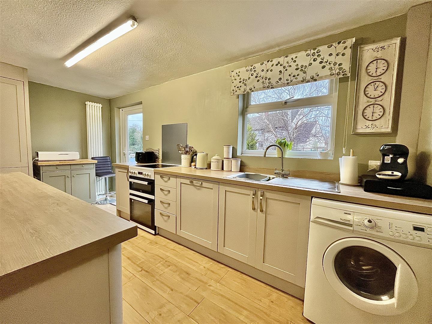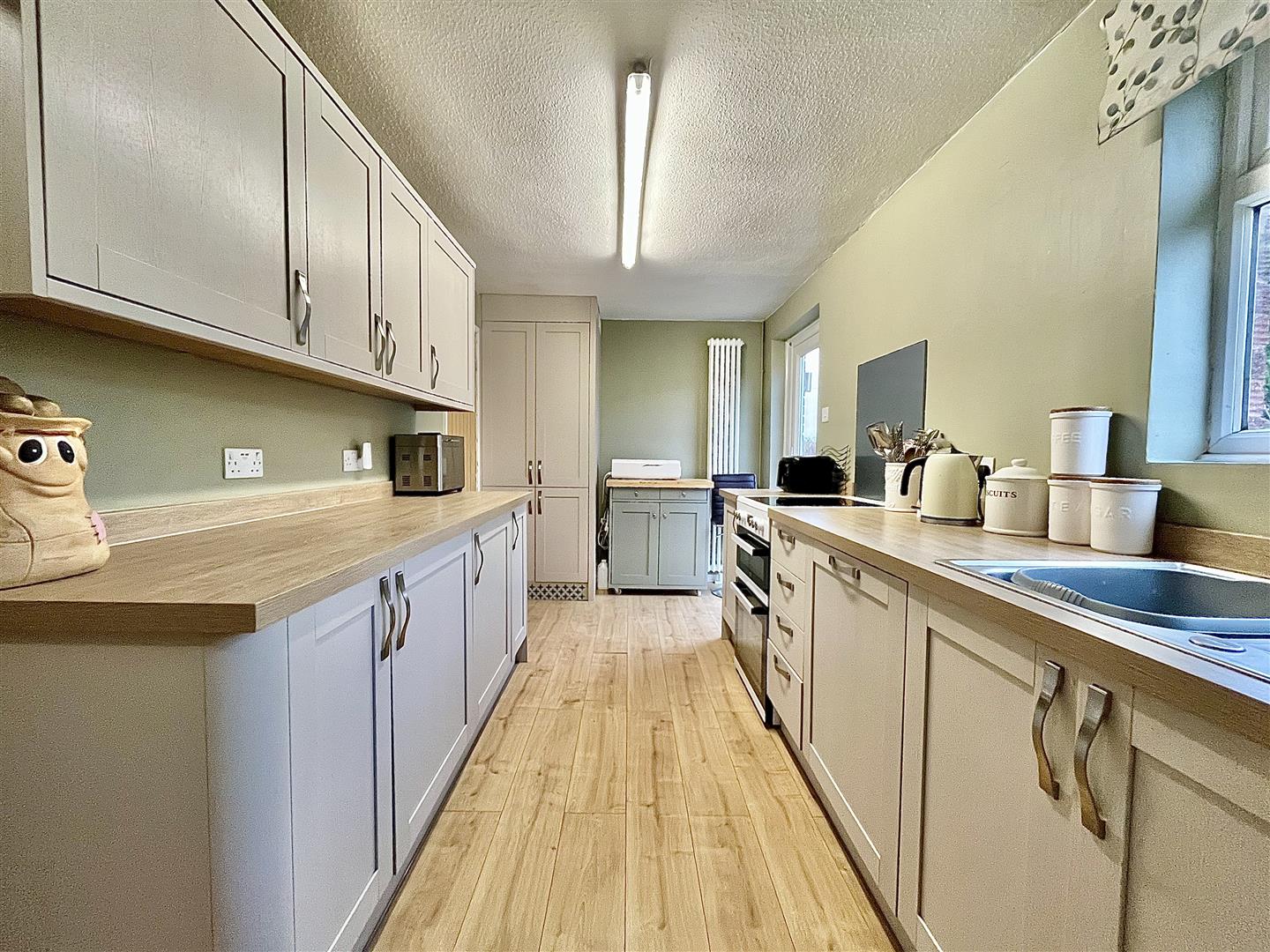 Kitchen - 4.90m x 2.29m (16'01 x 7'06) - Comprising a range of sleek and stylish fully fitted wall and base mounted units with laminate wood effect worktops, inset stainless steel sink unit with drainer, integral appliances include a dishwasher, fridge and freezer. There is also space for a freestanding electric cooker and plumbing for a washing machine. A large pantry cupboard with light and shelving adds to the storage options, as well as a built in double cupboard housing the oil-fired combi boiler. Additionally there is laminate wood effect flooring, a radiator and a rear aspect window and door that leads out to the balcony.
