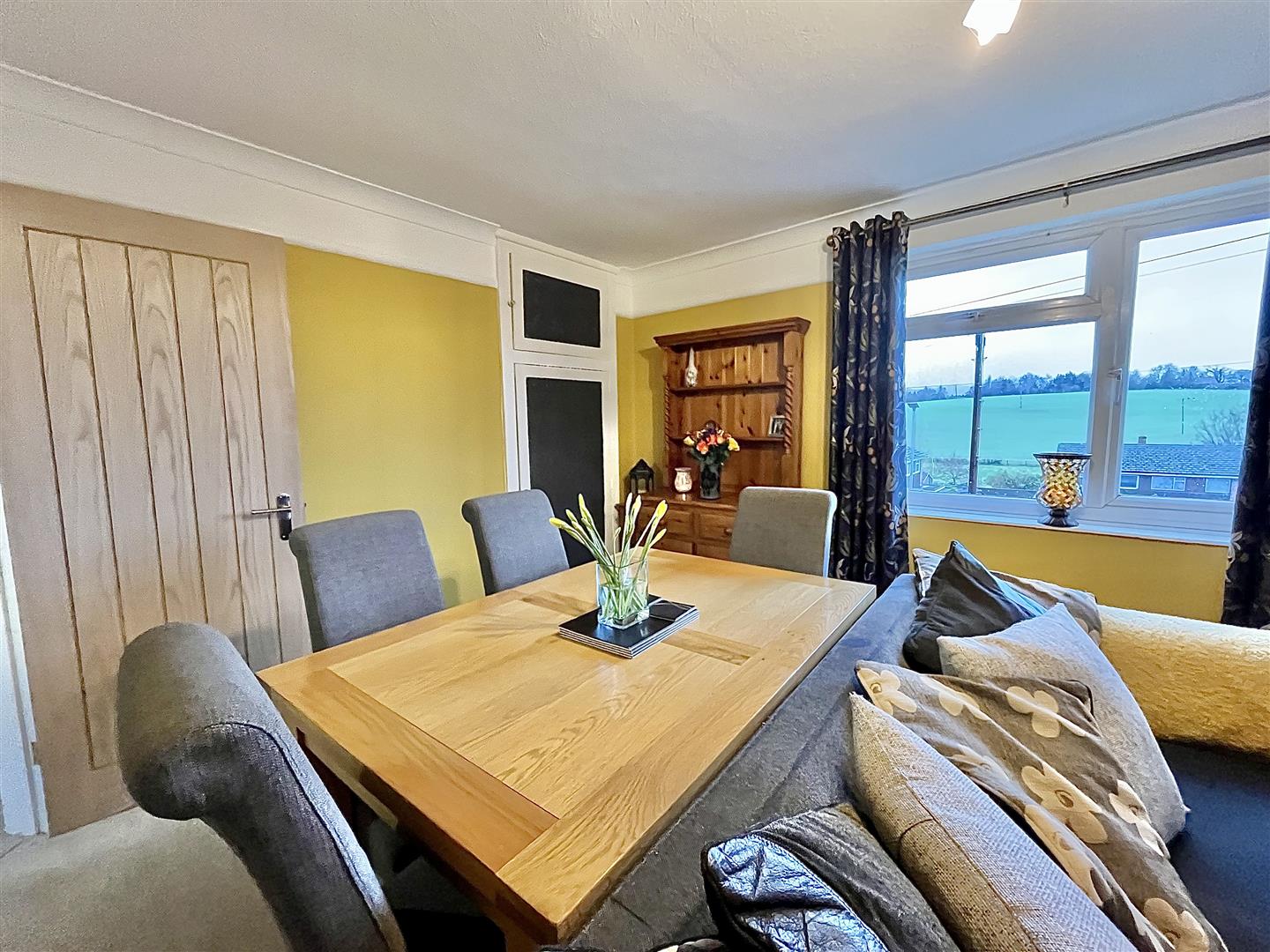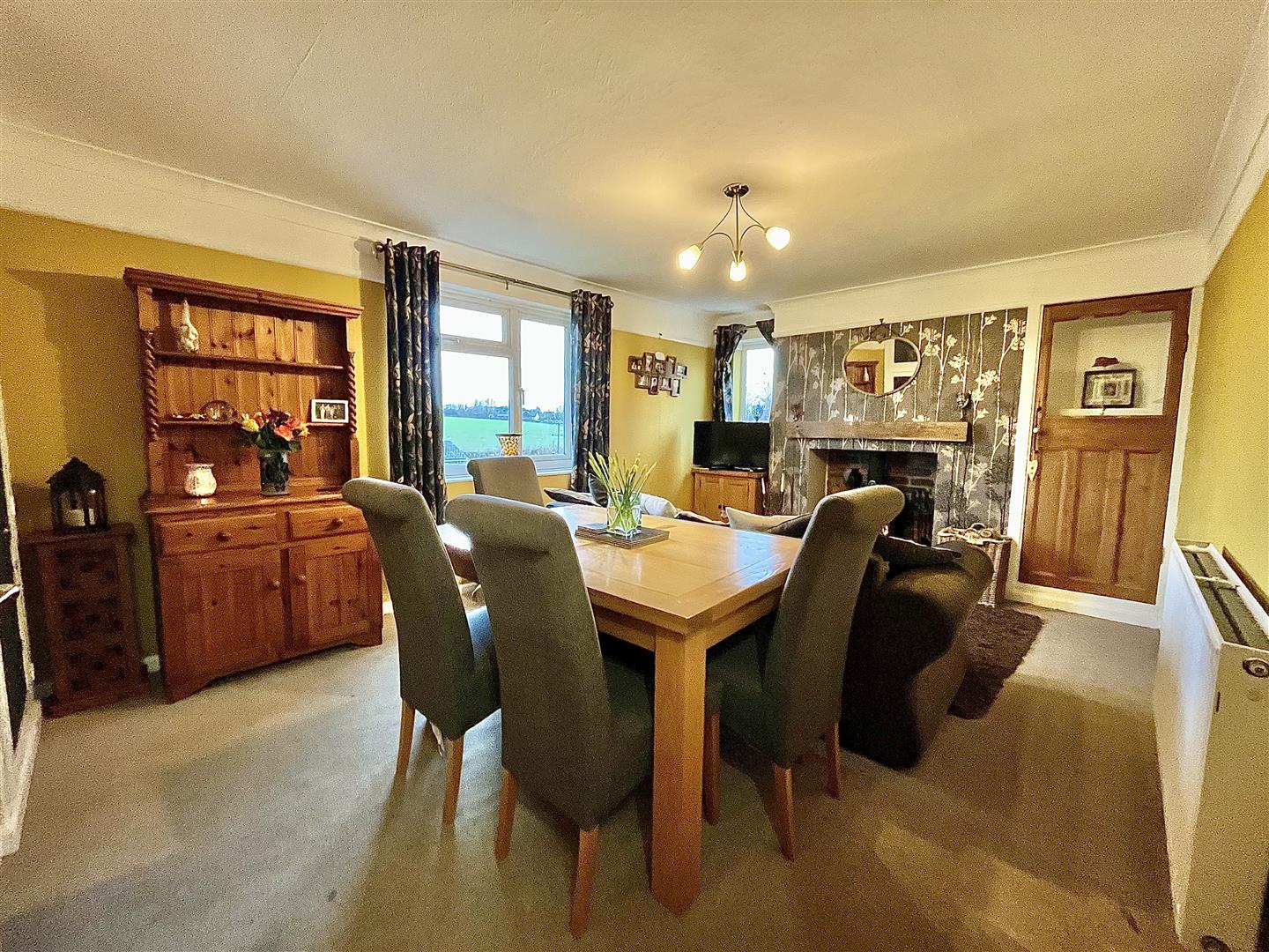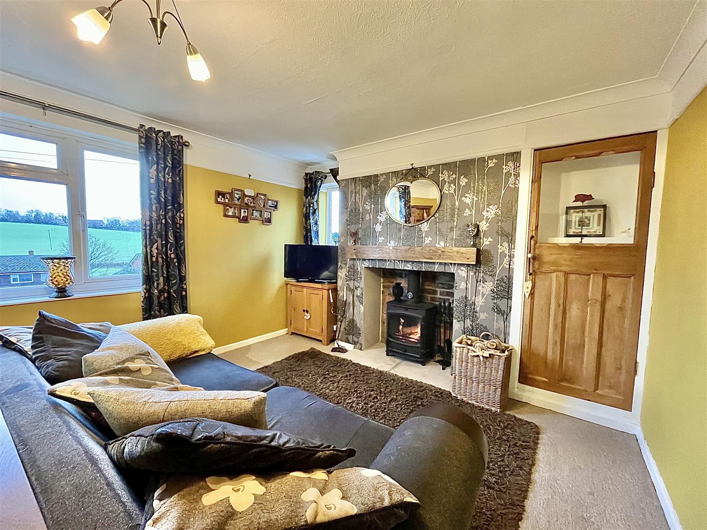 Lounge/Diner - 4.98m x 3.48m (16'04 x 11'05) - A warm and inviting space thanks to the feature fireplace with inset wood burner sat on a stone hearth with oak lintel above, alcove to the side with built in storage cupboard, an additional large store cupboard with shelving, radiator and front and side aspect windows having wonderful views towards fields and countryside.
