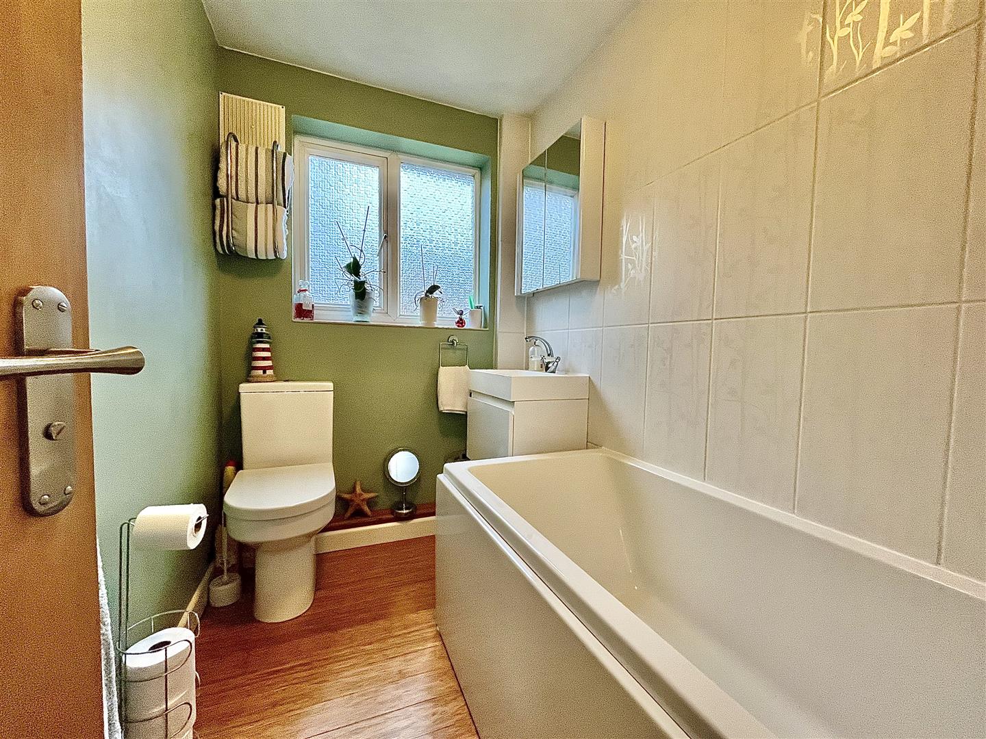 Bathroom - 2.24m x 1.50m (7'04 x 4'11) - Comprising a modern white three piece suite to include a bath with electric shower over, close coupled w.c and wall mounted vanity washbasin unit. There is also a heated ladder towel rail, partly tiled walls and an obscured rear aspect window.