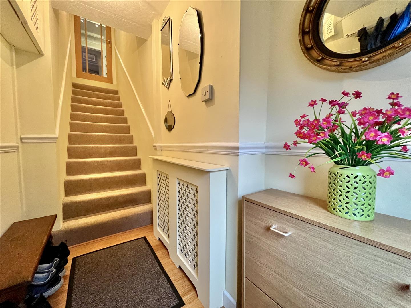 Entrance Hall - A welcoming space ideal for keeping coats and shoes, featuring wood flooring, radiator and stairs that lead up to the first floor hallway.
