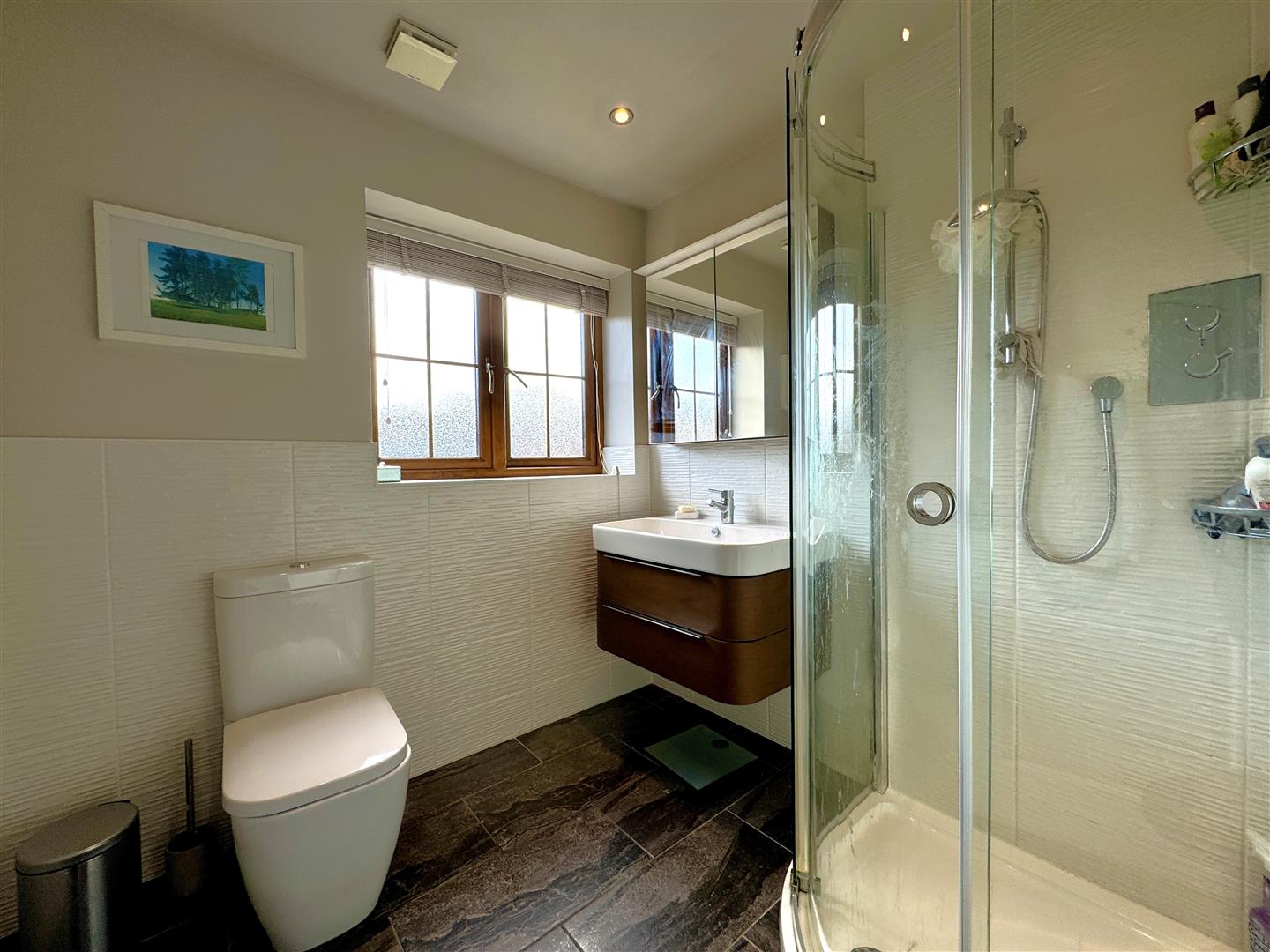 En-Suite Shower Room - 2.13m x 1.98m (7'0 x 6'6) - WC, large vanity wash hand basin with mixer tap, cupboards below, medicine cabinet, corner shower cubicle with inset shower system, tiled flooring, tiled splashbacks, chrome heated towel rail, extractor fan, spotlighting, front aspect frosted window.