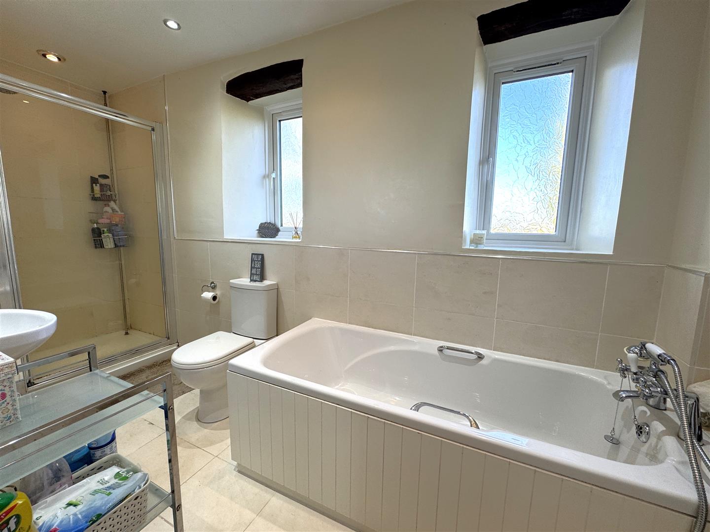 Bathroom - 4.01m x 1.55m (13'2 x 5'1) - Single radiator, door to airing cupboard with slatted shelving and storage space, underfloor heating, panelled bath with mixer tap and shower detachment, WC, double shower cubicle with inset shower unit, tiled floor, tiled splashbacks, heated towel rail, extractor fan, inset spotlighting, exposed beams, two front aspect windows offering lovely views over the surrounding countryside.