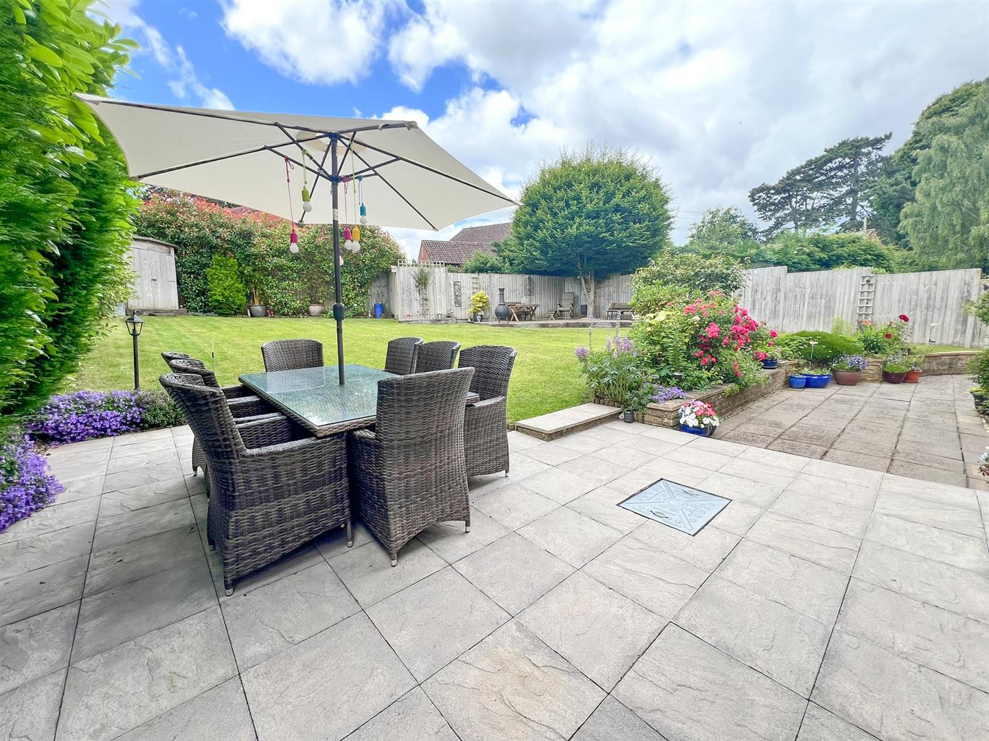 The rear garden boasts a large patio and seating area, a spacious lawned area with flower borders, shrubs, and bushes, all enclosed by fencing and hedging. At the far end of the garden, there is a raised patio seating area with lighting.
