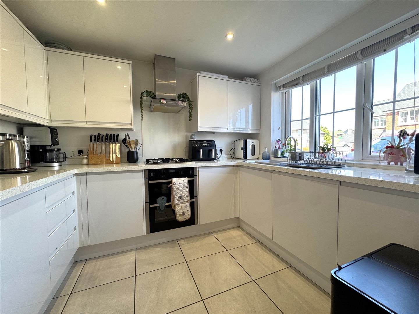 Kitchen - 2.95m x 2.57m (9'8 x 8'5) - The kitchen comprises a range of base and wall mounted units with laminated worktops and splashbacks, one and a half bowl stainless steel sink unit with mixer tap, integrated NEFF oven with four ring gas hob and extractor fan over, integrated NEFF dishwasher and fridge / freezer, tiled floor, double radiator, inset spotlighting, front aspect window.