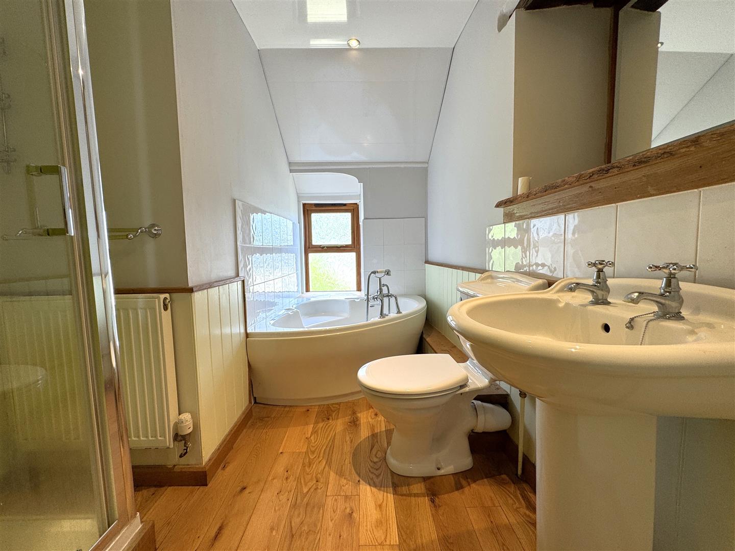 Bathroom - Four piece suite comprising corner bath with mixer tap and shower detachment, WC, wash hand basin, double shower cubicle accessed via sliding glazed screen with inset overhead and detachable hand shower, engineered oak flooring, single radiator, mirror with light, extractor fan, spotlighting, side aspect frosted window.