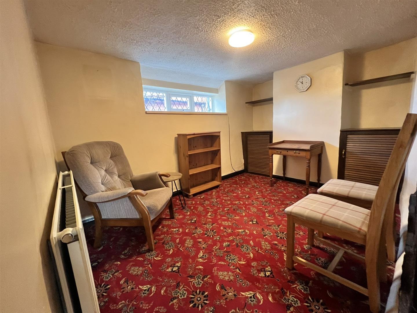 Dining Room - 3.71m x 2.57m (12'02 x 8'05) - Chimney breast with alcoves to either side, small cupboards to bottom with louvre doors, ceiling light, double radiator, power points, rear aspect upvc leadlight double glazed window.