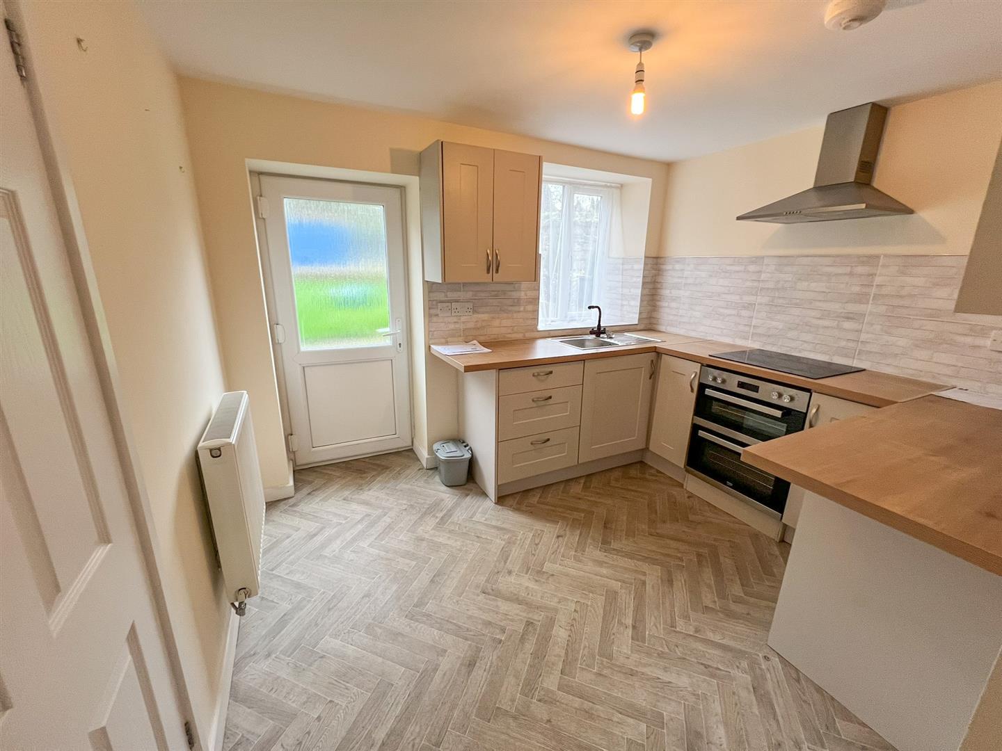 Kitchen - 3.12m x 2.46m (10'03 x 8'01) - Single bowl, half drainer stainless steel sink unit with mixer taps over, wood effect rolled edge worktops, range of base and wall mounted units, four-ring induction hob, electric oven beneath, filter hood over, tiled surround, power points, double radiator, rear aspect upvc double glazed window overlooking the garden, rear aspect upvc obscure glazed panel door opening to rear garden, door opening into: