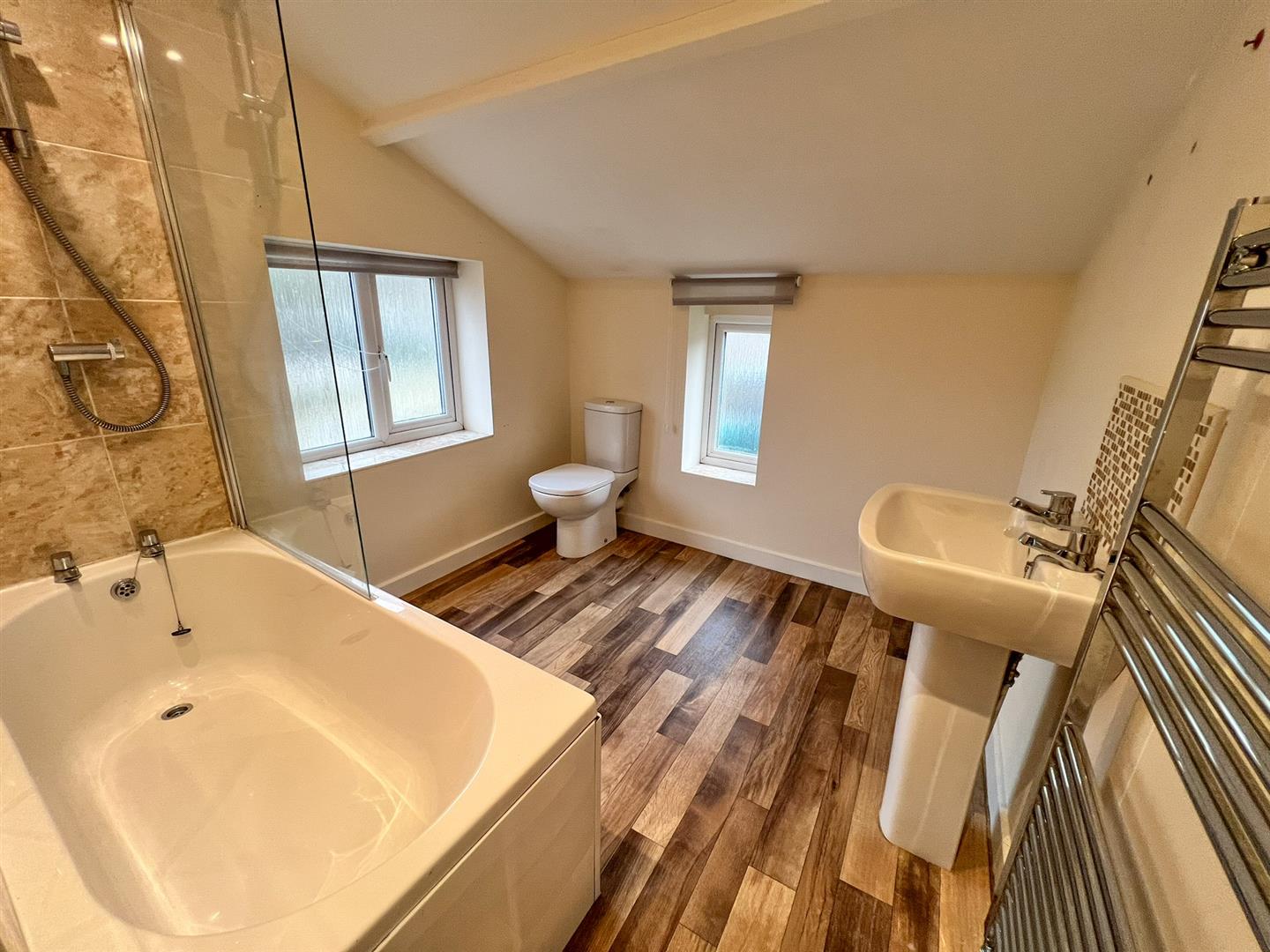 Bathroom - 2.46m x 2.29m (8'01 x 7'06) - Sloped ceiling, white suite with close coupled w.c, pedestal wash hand basin, tiled splashback, modern side panel bath, mains fed shower fitted over, shower screen, chrome heated towel radiator, wood effect vinyl flooring, side and rear aspect obscure double glazed upvc windows.