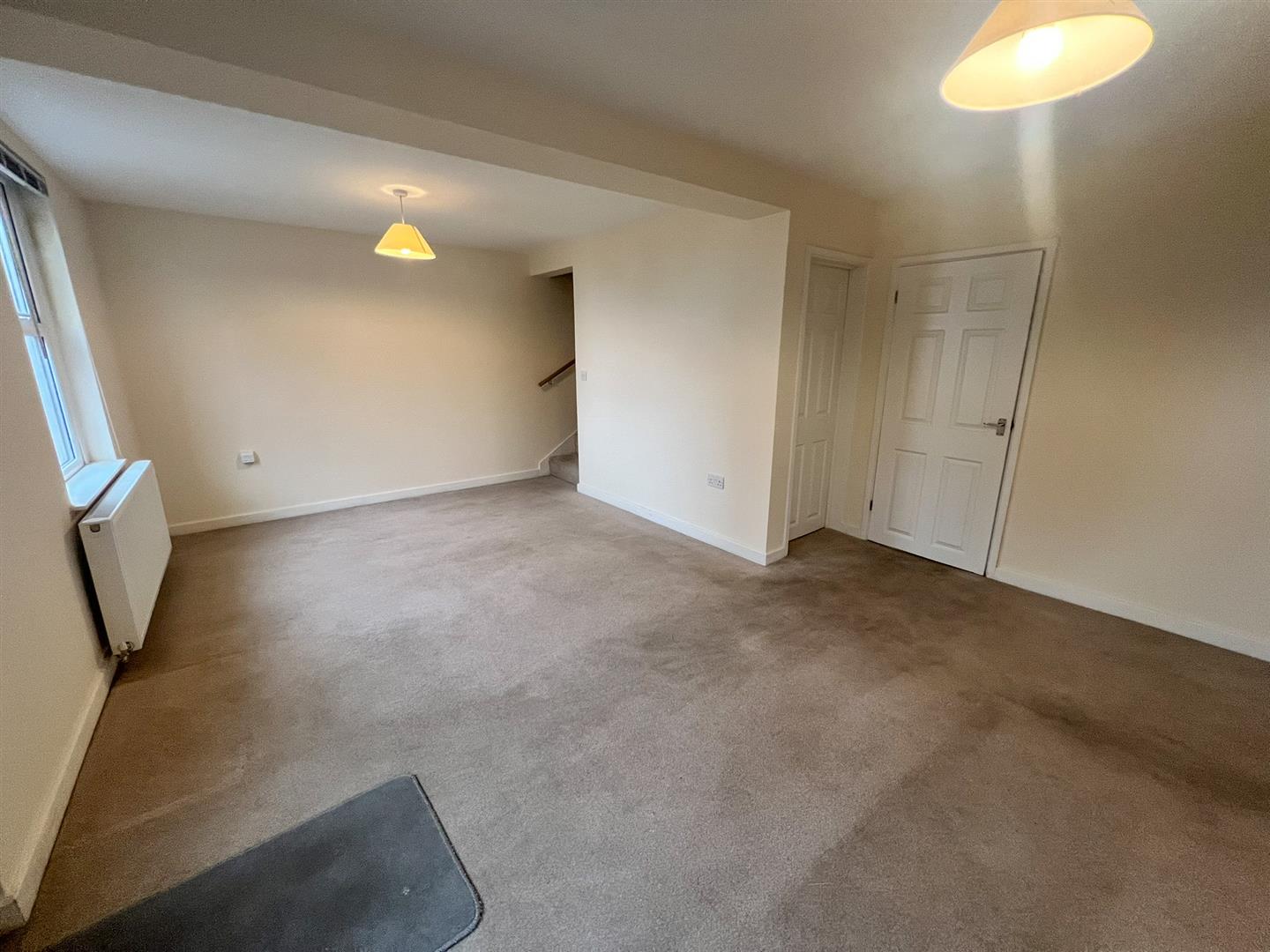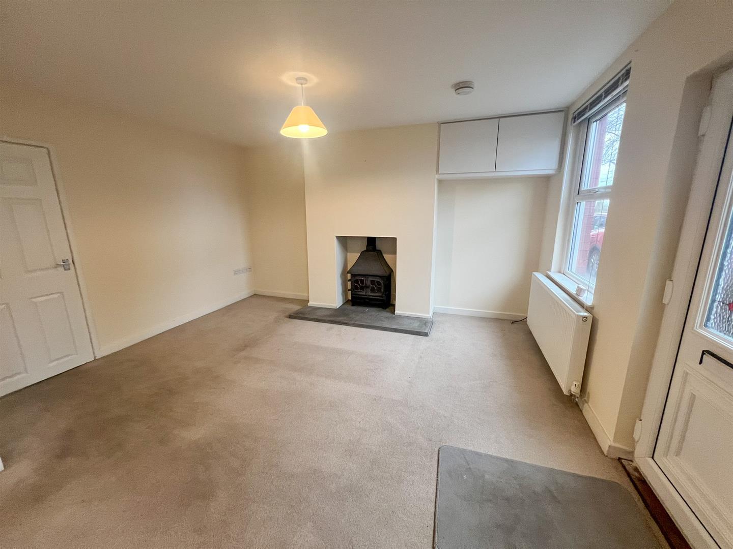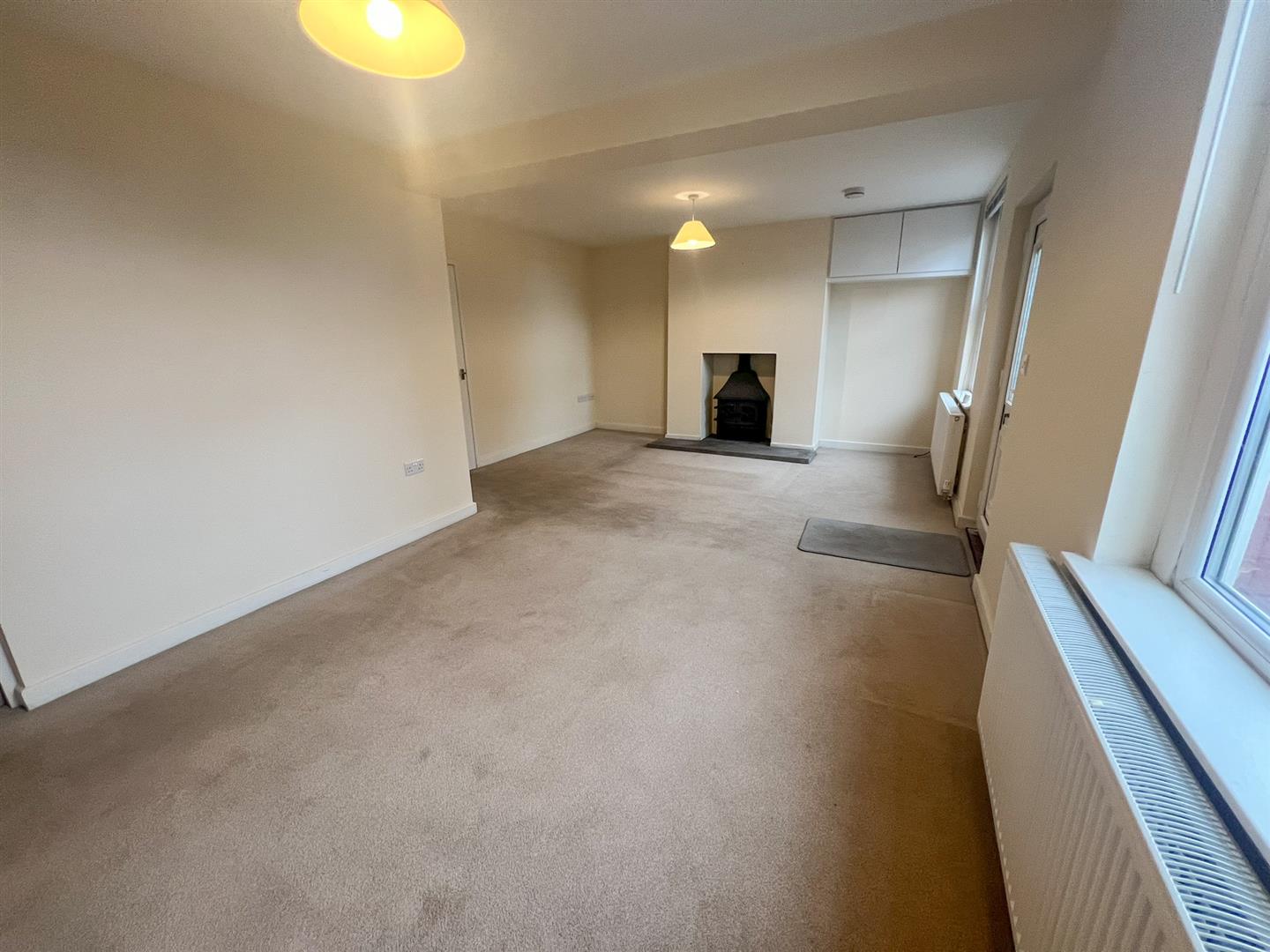 Lounge/Dining Room - 6.43m x 4.17m narrowing to 3.23m (21'01 x 13'08 na - Feature fireplace with paved hearth, inset woodburning stove, two ceiling lights, two double radiators, power points, tv point, telephone point, door to high level cupboard housing the electric meter, access to understairs storage area with lighting, two front aspect upvc double glazed windows with views towards the church, wooden panel door gives access into: