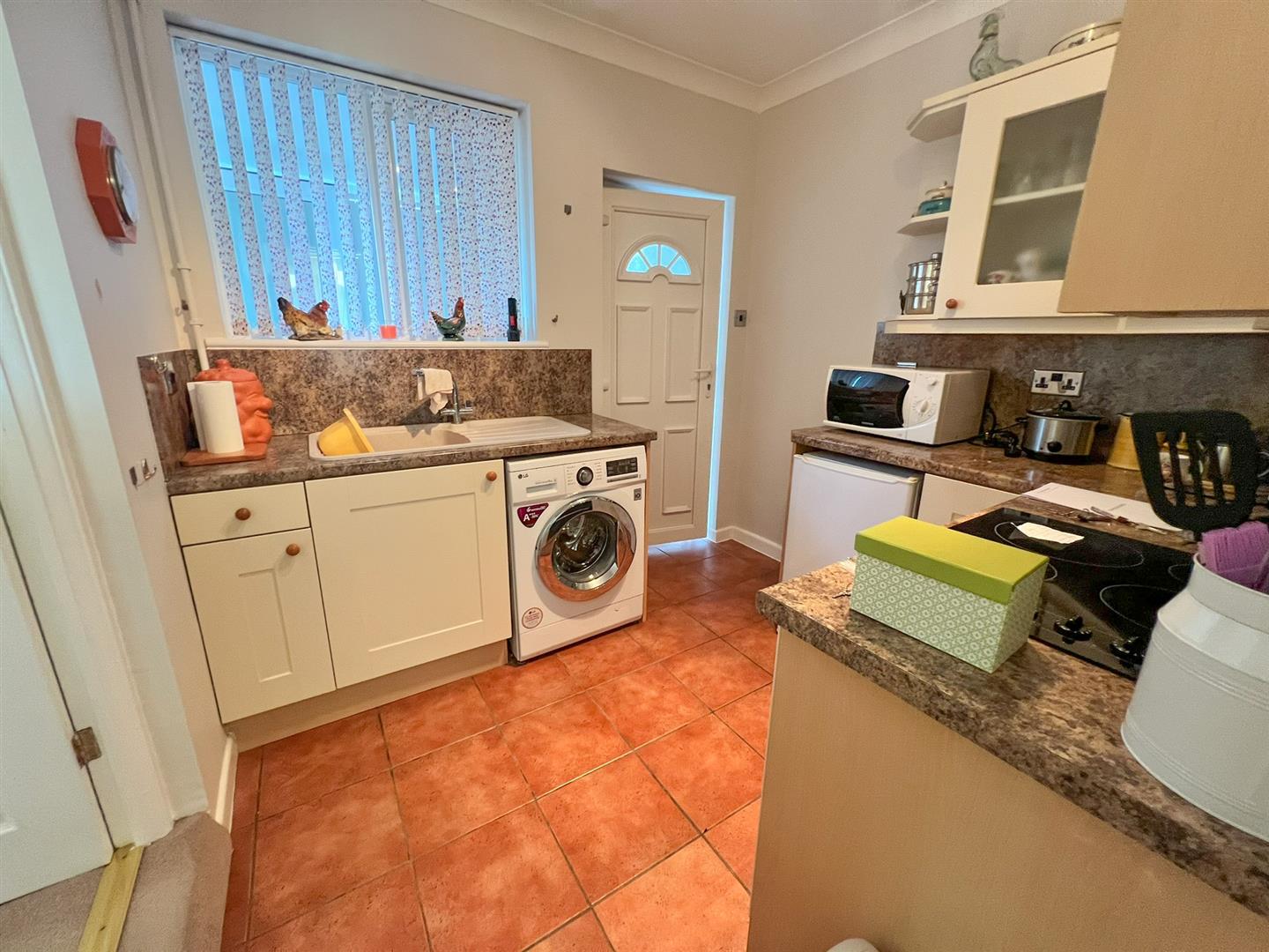 Kitchen - 2.62m x 2.39m (8'07 x 7'10) - Single bowl, single drainer sink unit with mixer tap over, rolled edge worktops, matching upstands, range of base and wall mounted units, power points, four-ring electric hob, electric double oven beneath, filter hood above, space for washing machine, space for under counter fridge, ceiling spots, coving, tiled flooring, central heating timer controls, thermostat, front aspect upvc double glazed window opening into the front porch, step up and door giving access into: