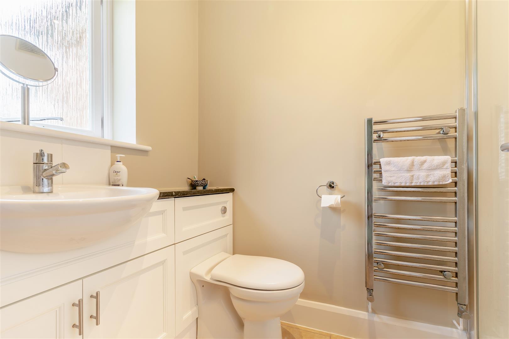 En-Suite Shower Room - Fitted double shower cubicle and tray, shower, panelled surround, close coupled w.c., vanity wash hand basin, cupboards below, tiled splashback, tiled flooring, heated towel rail, rear aspect frosted window.