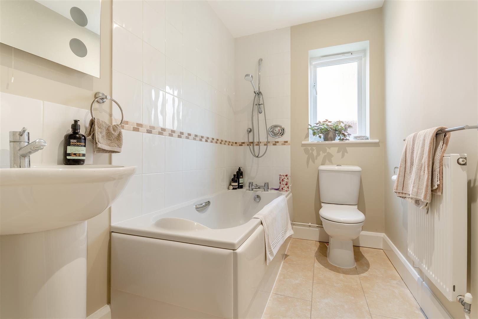Bathroom - White suite comprising modern panelled bath, shower attachment over, tiled surround, pedestal wash hand basin, tiled splashback, close coupled w.c., tiled flooring, single radiator, side aspect frosted window.