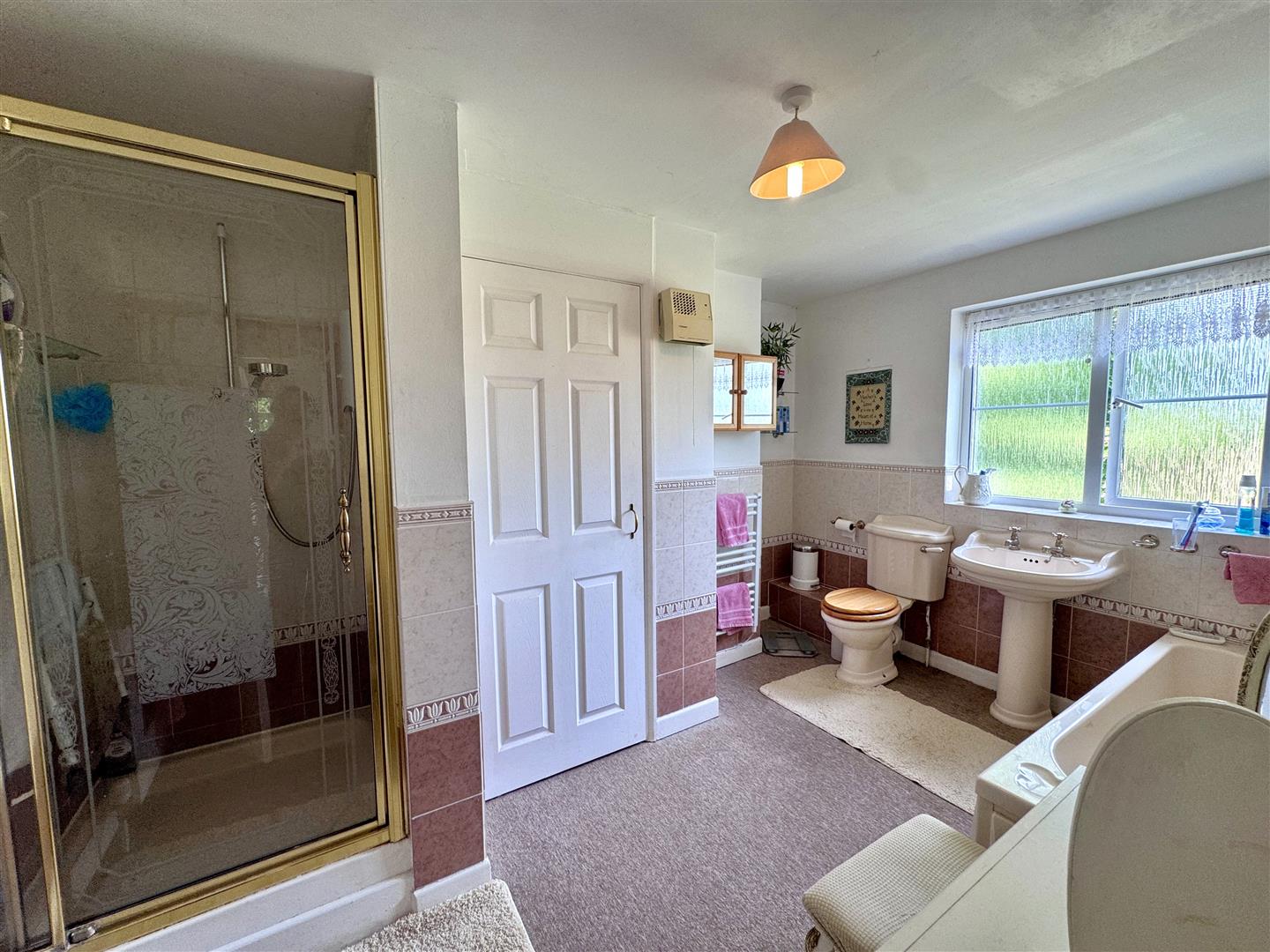 Bathroom - 3.71m x 2.67m max (12'2 x 8'9 max) - Four piece suite comprising panelled bath, WC, wash hand basin, separate shower cubicle with Mira Sport electric shower, tiled splashbacks, radiator, heated towel rail, door to airing cupboard with single radiator, slatted shelving and storage space, rear aspect frosted window.