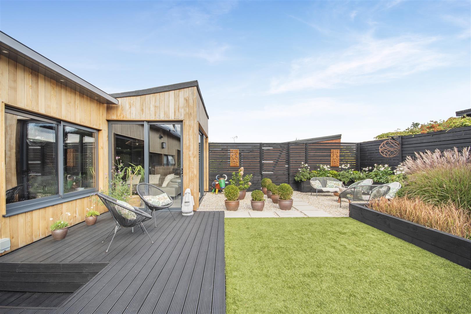 From the car port and parking area, a pathway and decked steps lead up to to the front garden measuring 35' x 30' approximately. It is beautifully designed to comprise decked seating areas and landscaped borders planted with herbaceous perennials and Box topiary. With low maintenance in mind, there is an artificial lawn area. The gardens are enclosed by wood panelled fencing. Gated side access from here leads to the rear gardens which currently house metal sheds, outside power points, LPG tank. The rear gardens have battery operated retracting overhead blinds covering the decked area which has a hot tub (available via separate negotiation). There is an astro turf lawn, gravelled seating areas with raised sleeper beds planted with herbaceous perennials and Box topiary, outside power and lighting with gated access through to: