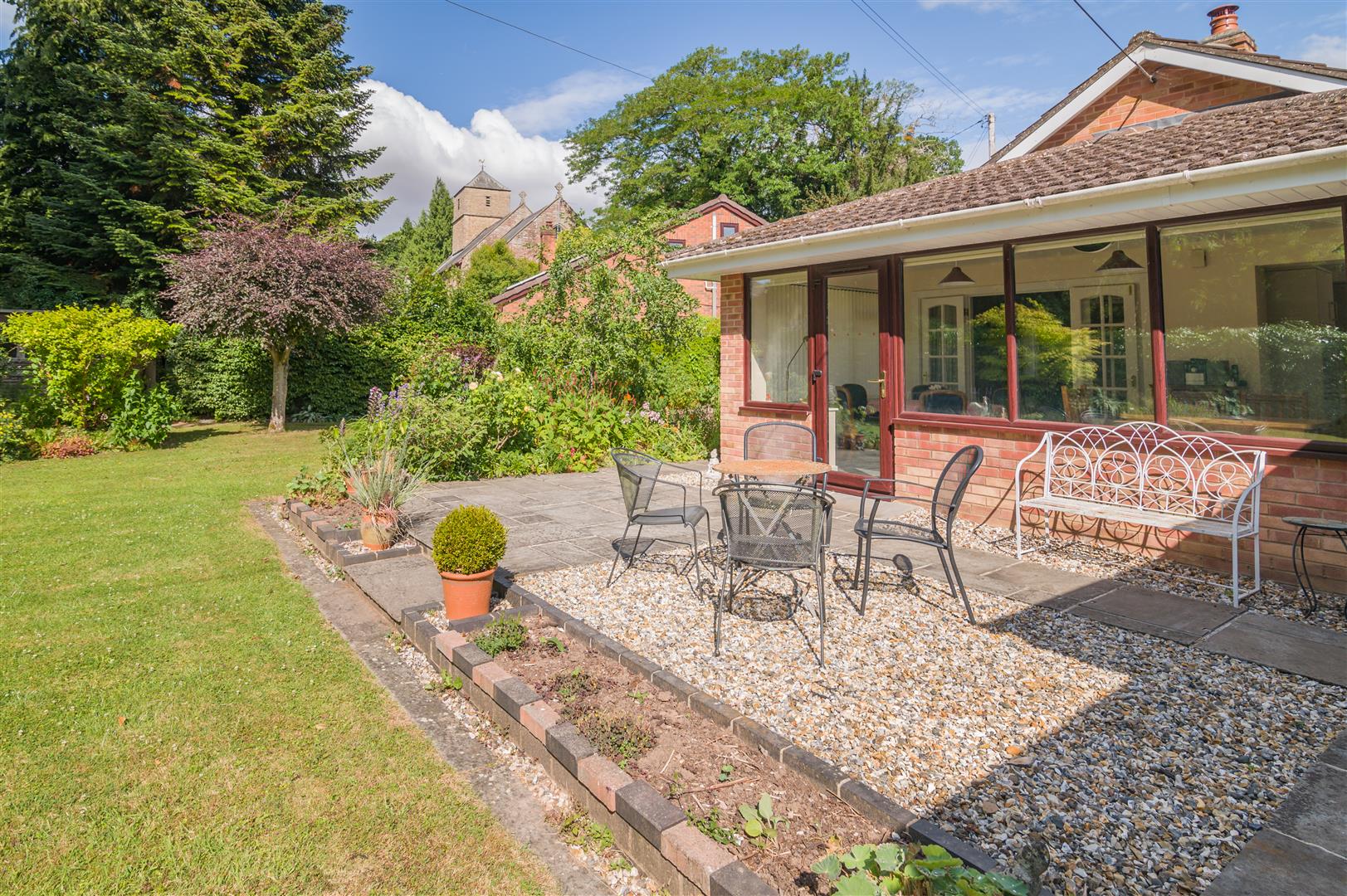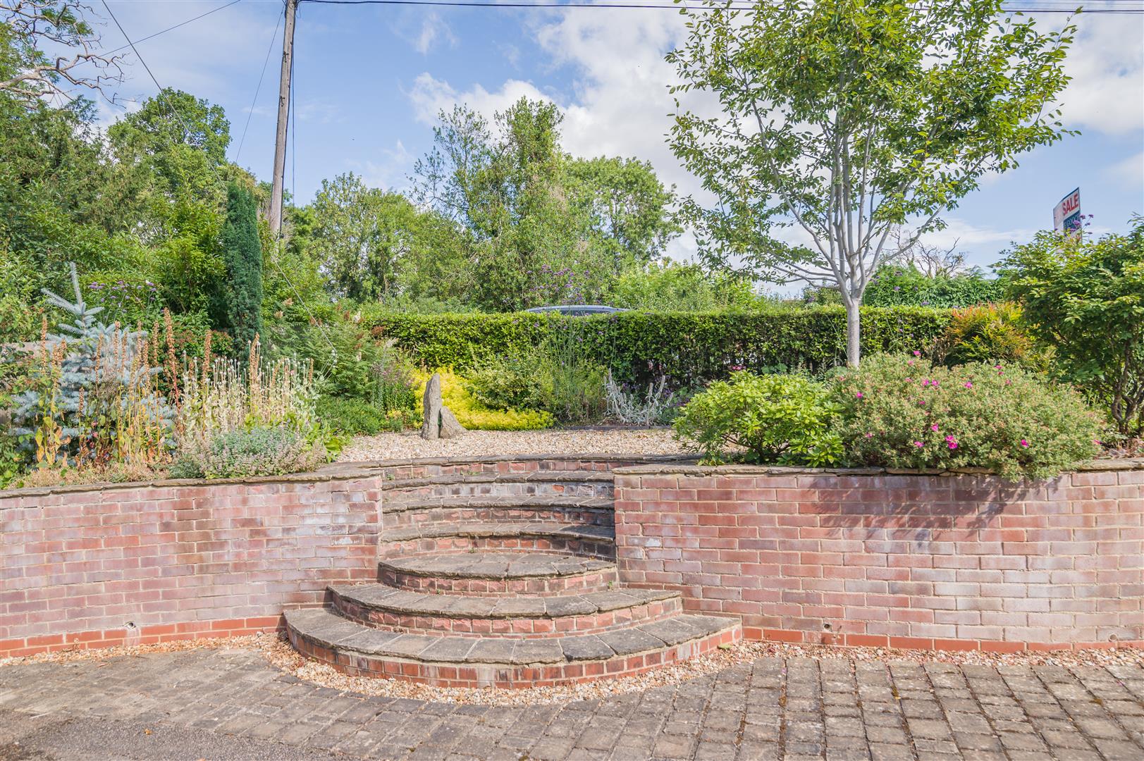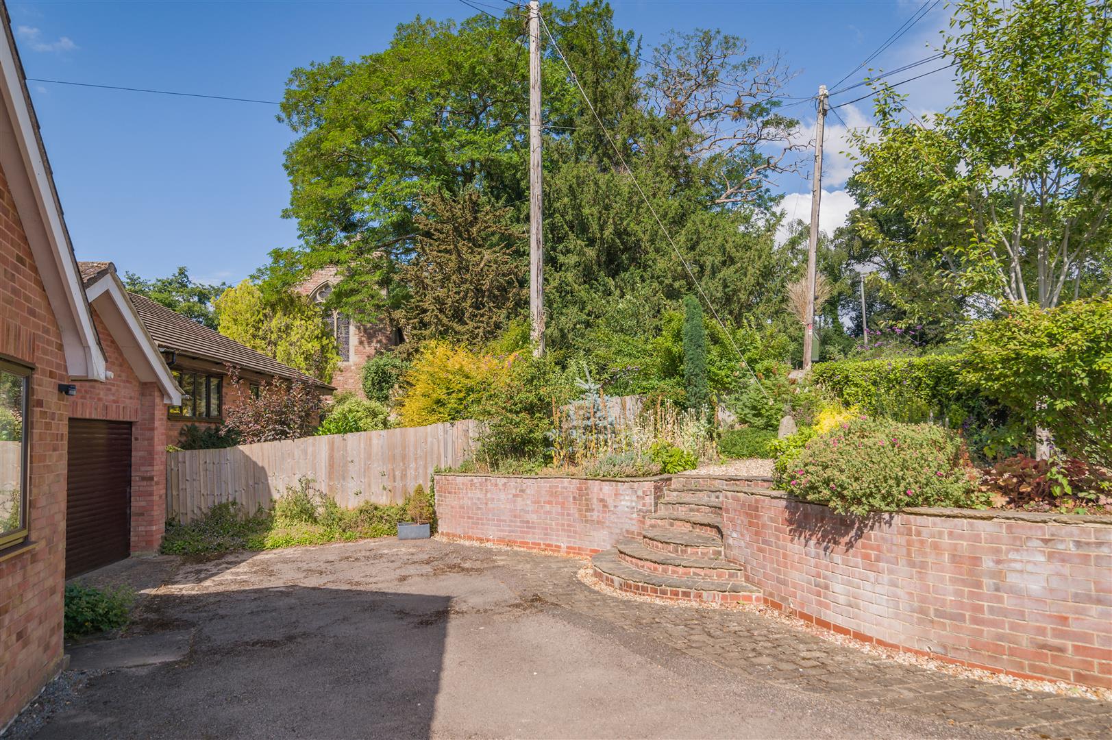 Garden area with steps leading up to a gravelled patio area, flower borders surround with mature flowers and shrubs, outside lighting.