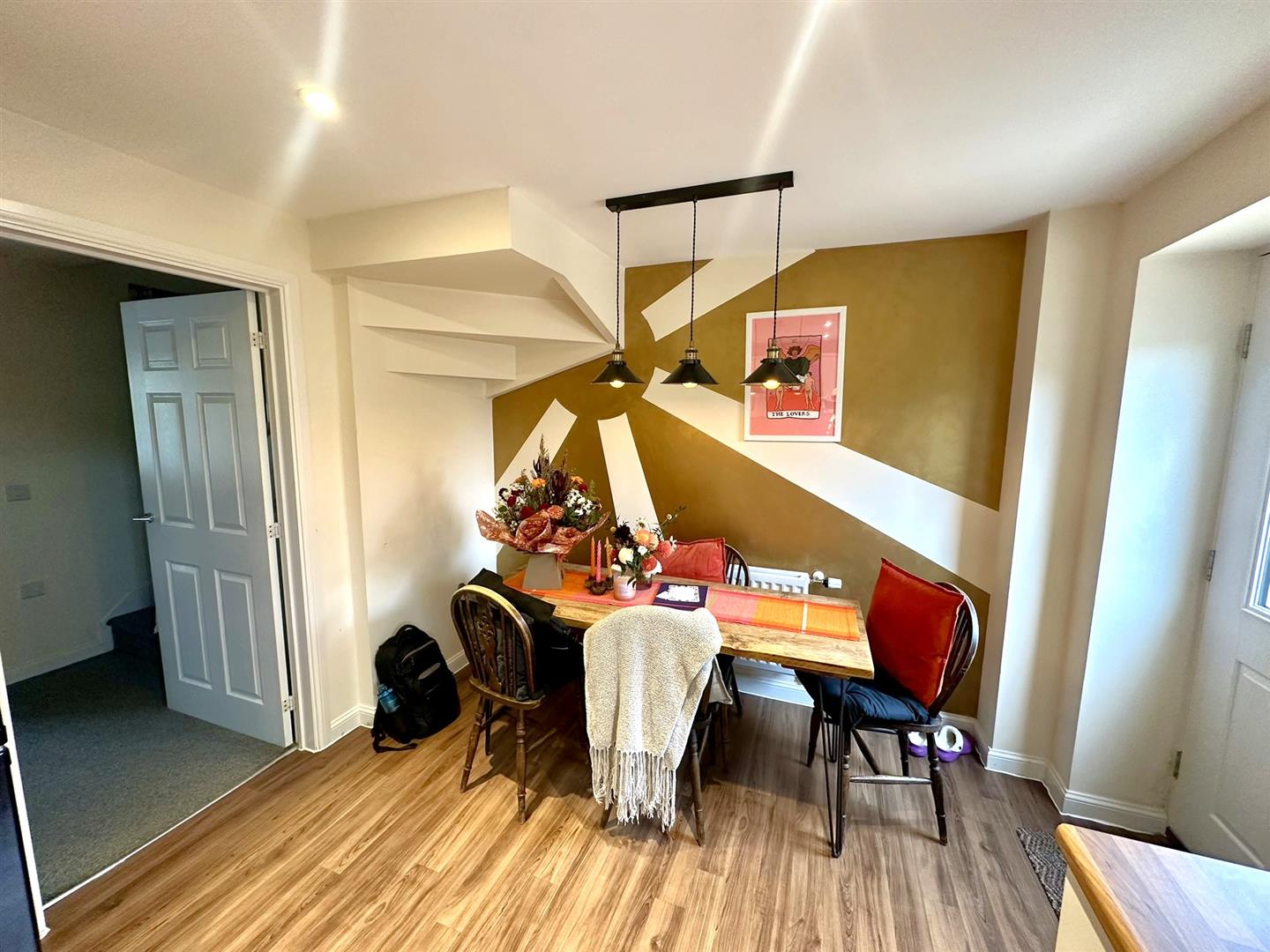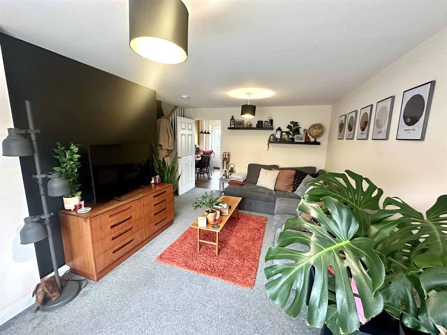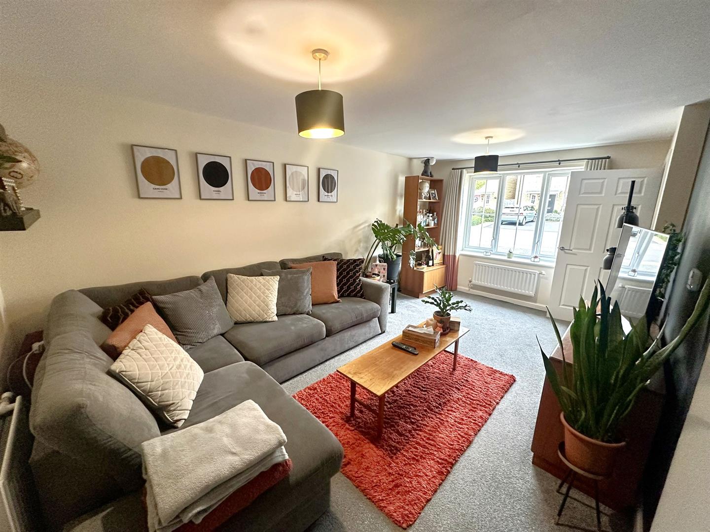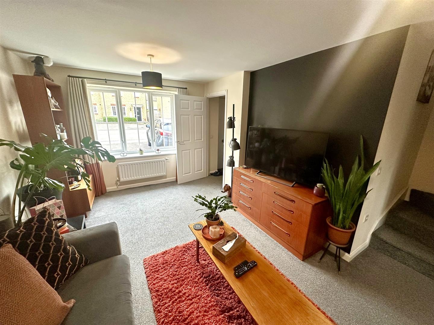 Lounge - 5.28m x 3.15m widening to 4.67m into stair recess - Virgin fibre optic point, two double radiators, network points, thermostat controls, under stairs storage cupboard, turning staircase leading off, front aspect window. Door to: