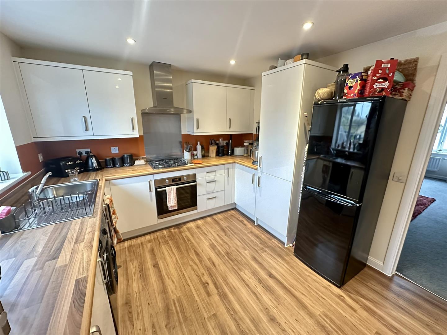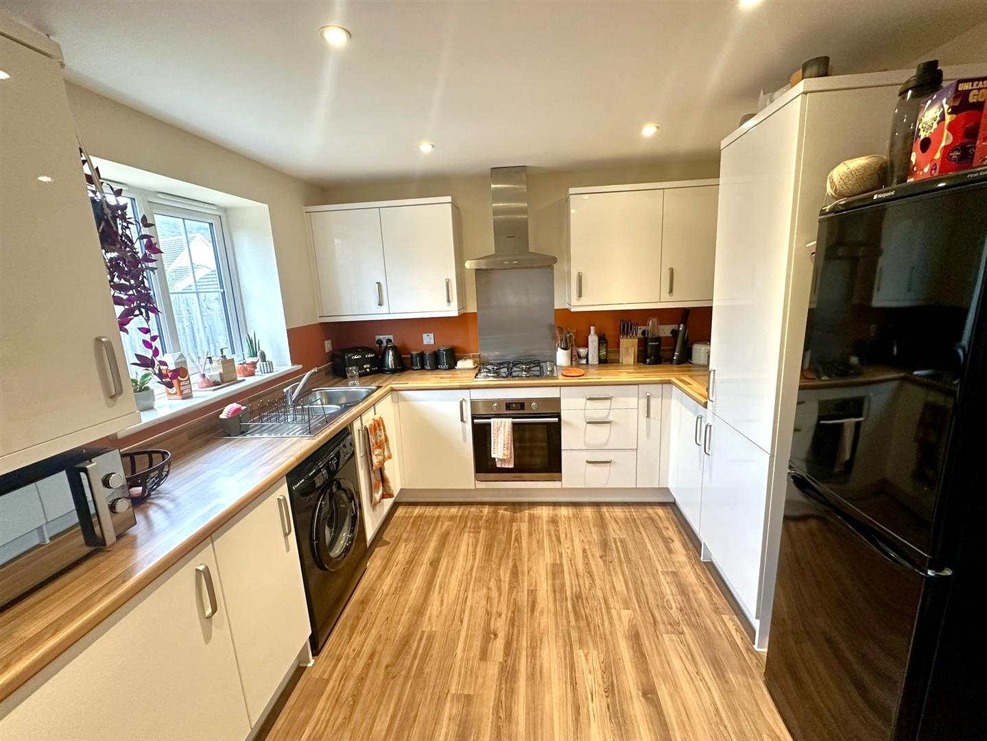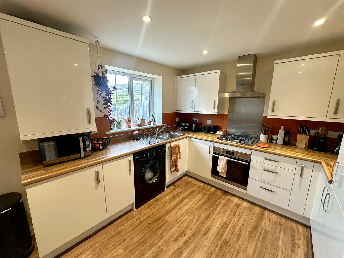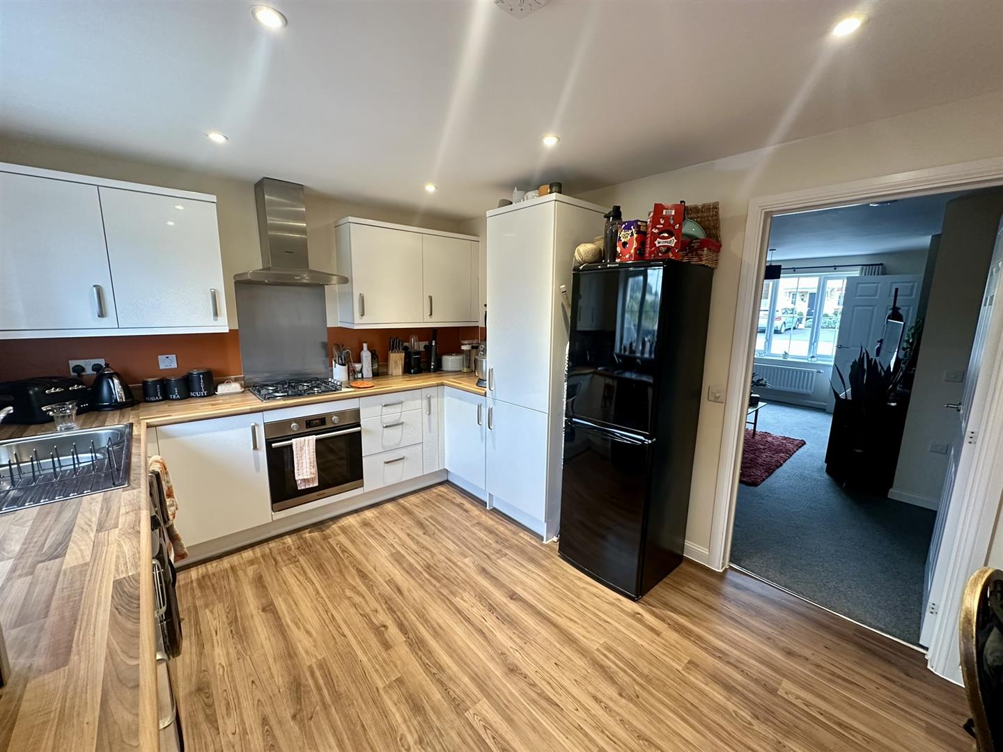 Kitchen / Diner - 4.67m x 3.05m (15'4 x 10'0) - The kitchen area comprises of a range of base and wall mounted units with laminated worktops and splashbacks, plumbing for washing machine, space for freestanding fridge / freezer, integrated Hotpoint oven with four ring gas hob and extractor fan over with stainless steel splashback, double radiator, electric boiler, inset spotlighting, rear aspect window with views towards Cleeve Hill, half glazed back door to the gardens.