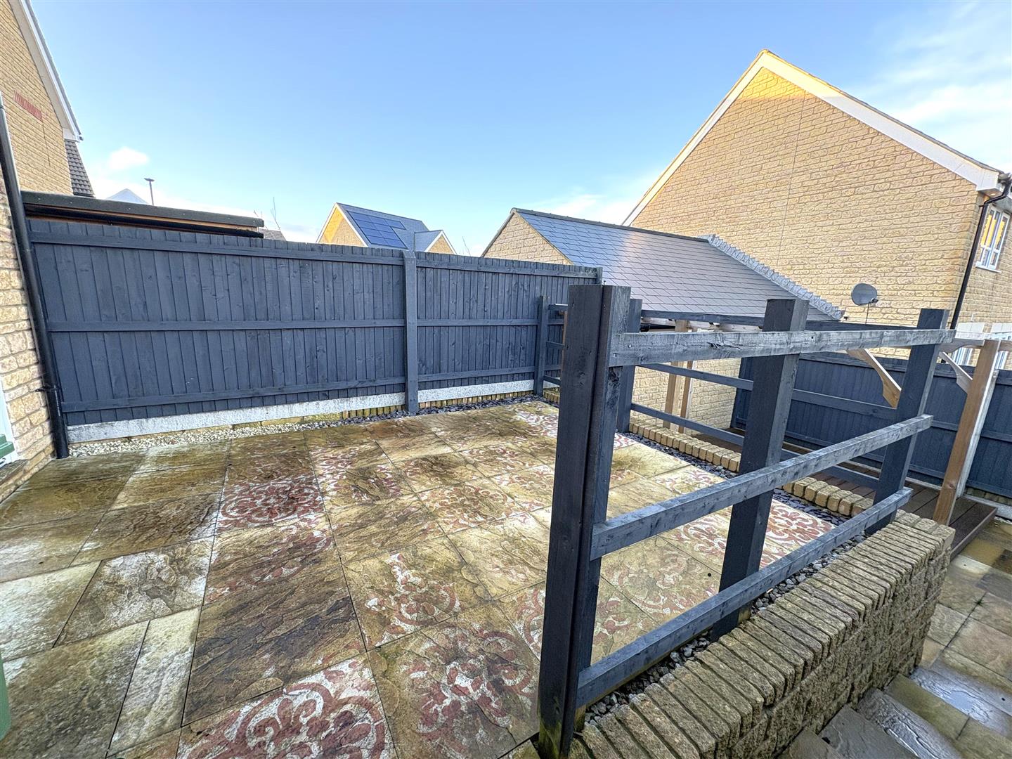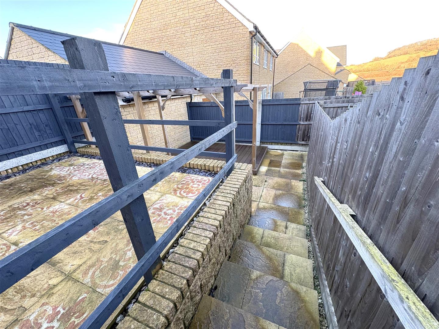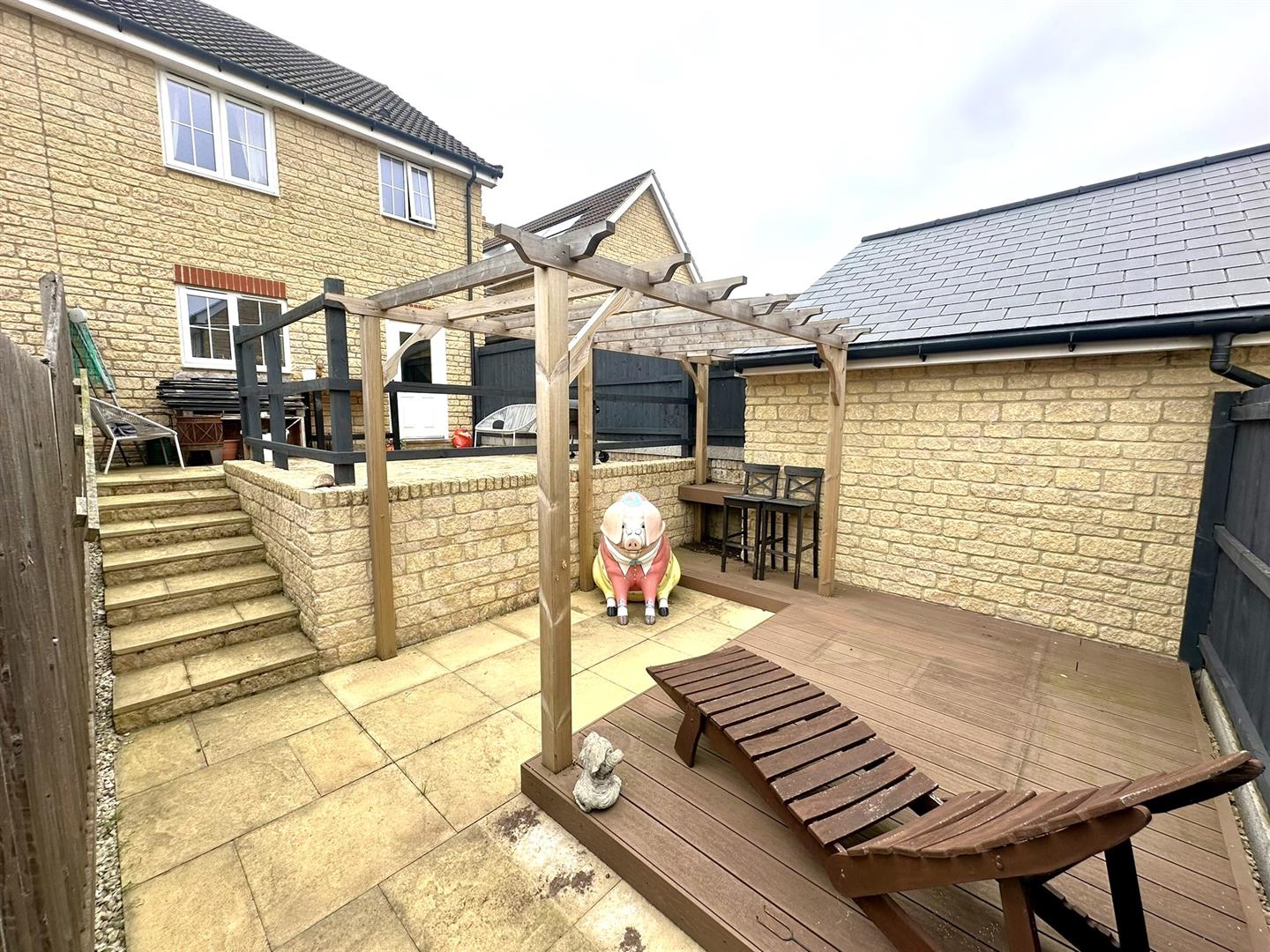 Outside - To the front of the property, there is side by side parking for two vehicles, canopy over the front door, outside light. An alleyway provides pedestrian rear access to the rear garden. The rear garden is designed for low maintenance and the top tier is laid to patio with outside lighting. Steps lead down to the lower terrace with paved area, raised composite deck with pergola, all enclosed by wood panel fencing.