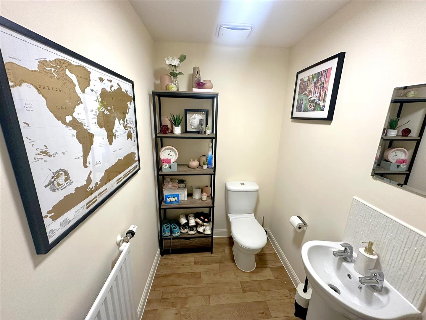 Cloakroom - 1.73m x 1.40m (5'8 x 4'7) - Low-level WC, pedestal wash hand basin, single radiator, extractor fan.