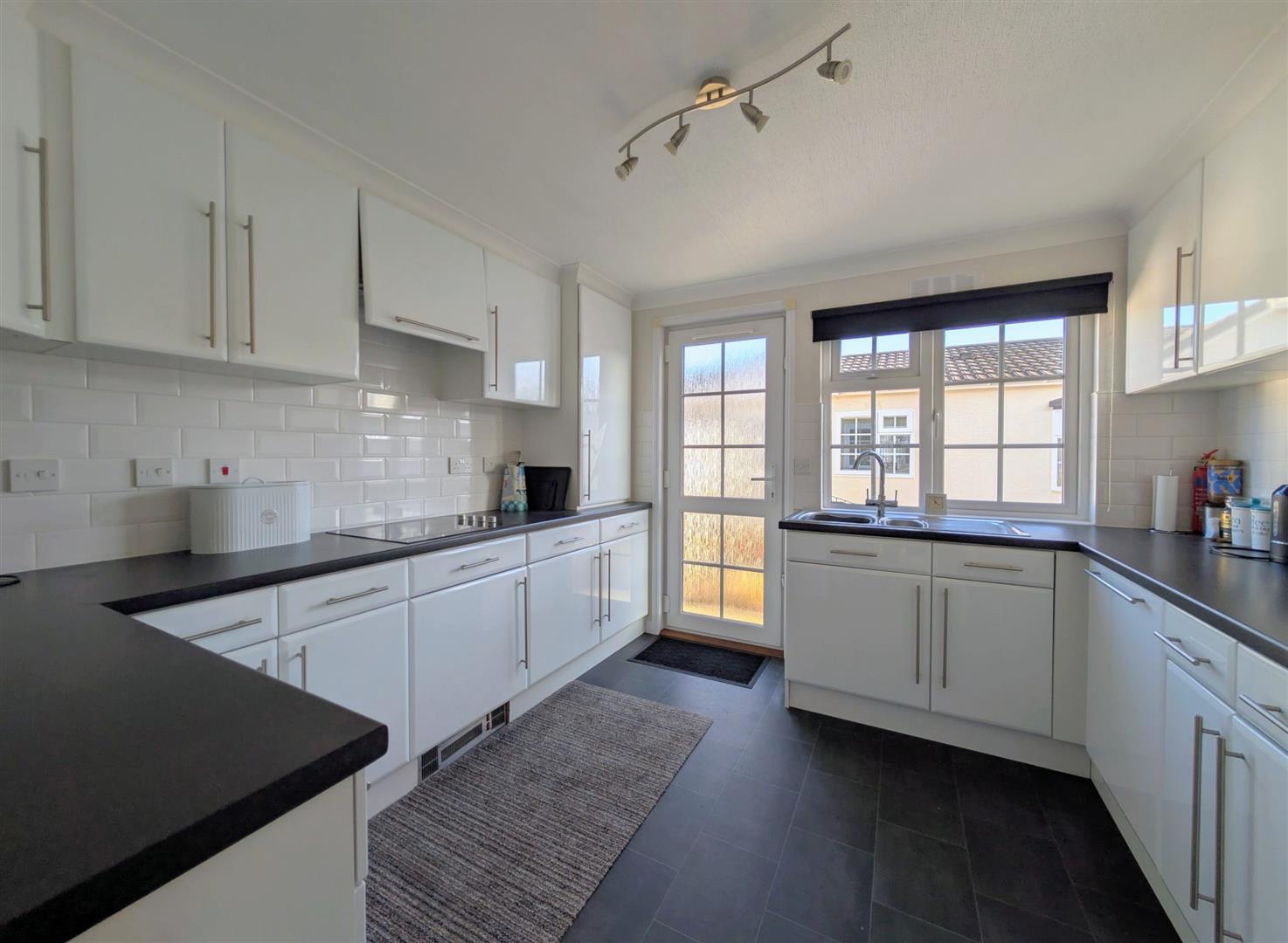 Kitchen - 3.23m x 3.15m (10'7 x 10'4) - A range of base and wall mounted units, laminated worktops, tiled splashback, single drainer one and a half bowl stainless steel sink unit with a mixer tap, built in electric double oven, ceramic hob, extractor hood, washing machine and fridge/freezer, cupboard housing the gas fired combination boiler, double radiator, coved ceiling, upvc double glazed Georgian style window and matching door to side elevation.