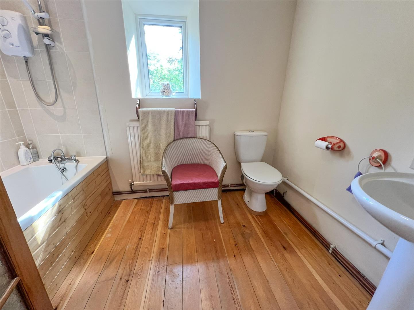 Bathroom - 2.67m x 1.93m (8'09 x 6'04) - White suite with close coupled w.c, pedestal wash hand basin with tiled splashback, side panel bath with electric shower fitted over, shower mixer tap, tiled surrounds, exposed timber floorboards, single radiator, side aspect upvc double glazed window overlooking the garden.