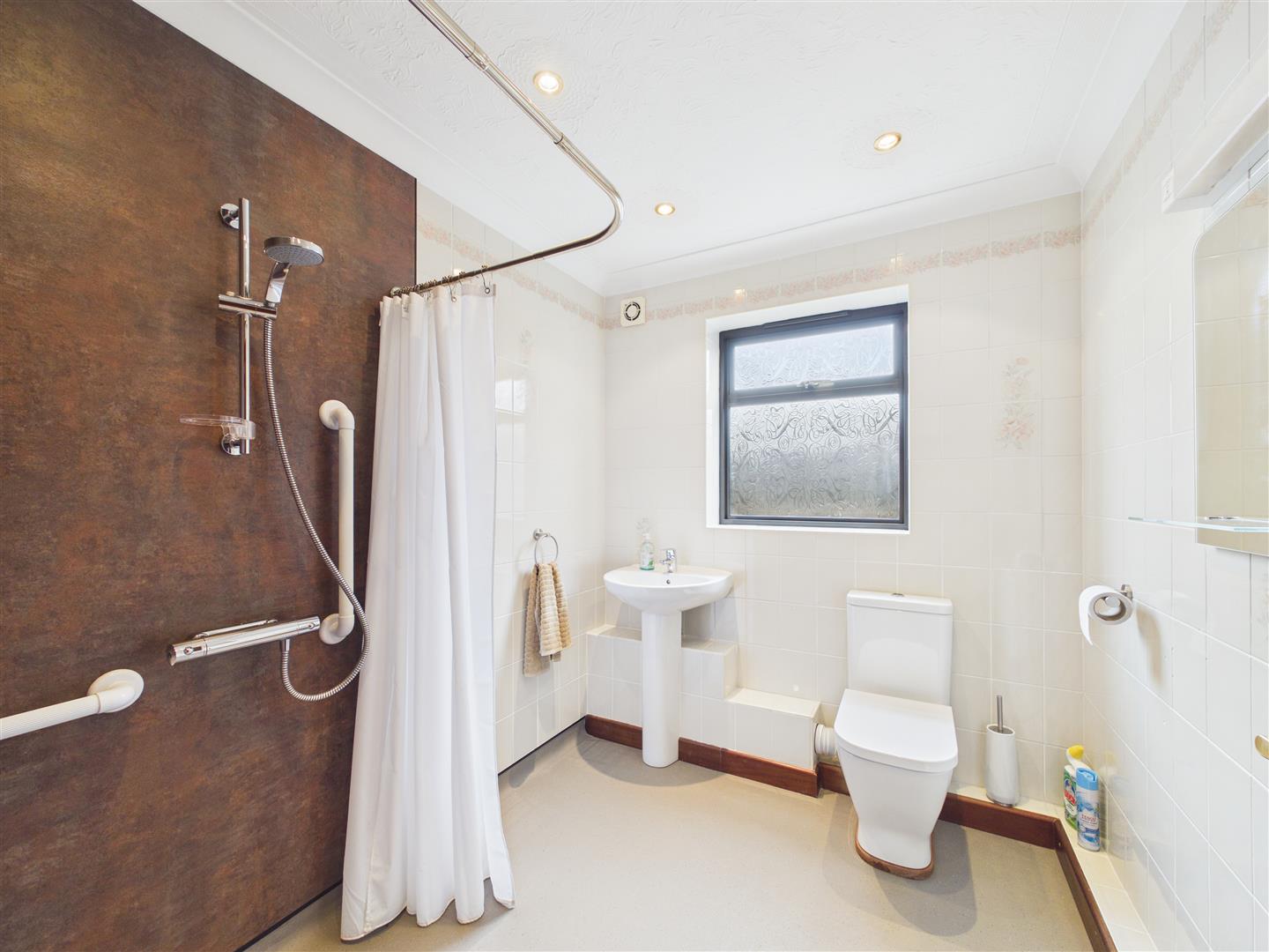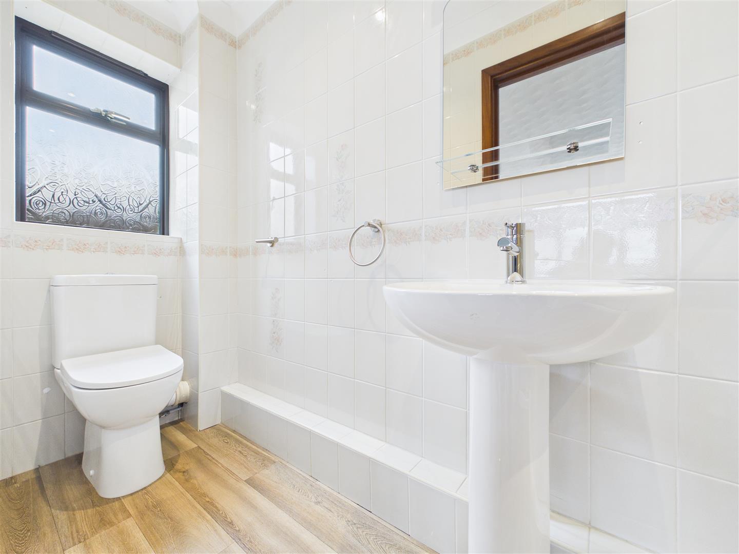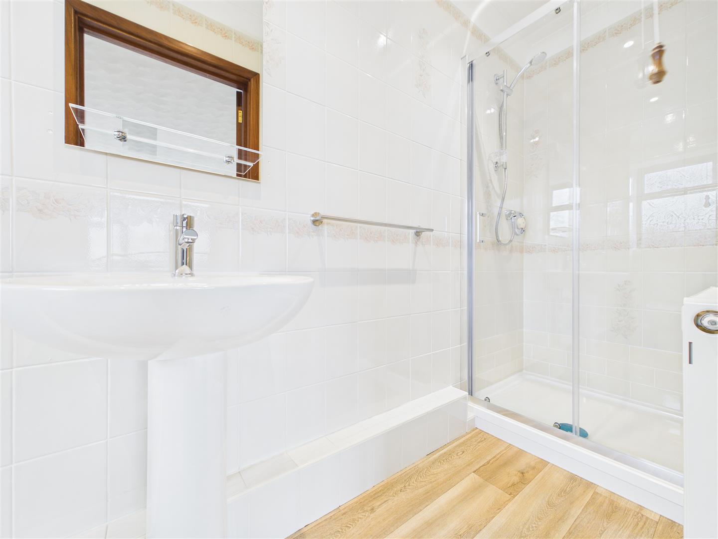 Wet Room - 1.93m x 2.31m (6'4 x 7'7) - Walk-in mains fed shower with wet board surround, close coupled w.c and pedestal washbasin, tiled walls, radiator, obscured side aspect window.