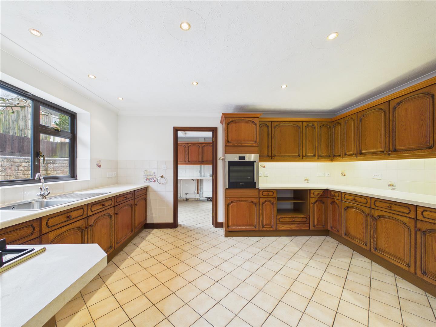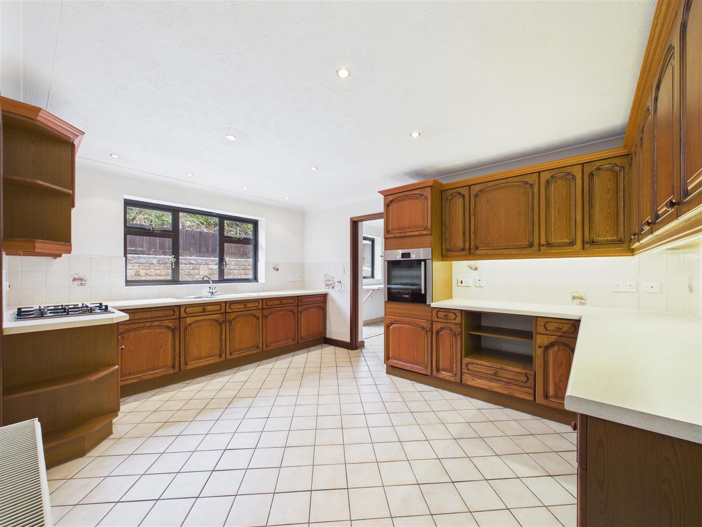 Kitchen - 4.42m x 3.38m (14'6 x 11'1) - Comprising a range of fully fitted wall and base level units with laminate worktops and tiled splash-backs, inset stainless steel sink unit with drainer, integral appliances include an eye level electric oven, gas hob, extractor hood and fridge. Tiled floor, radiator, rear aspect window, doors lead to the dining room and utility.