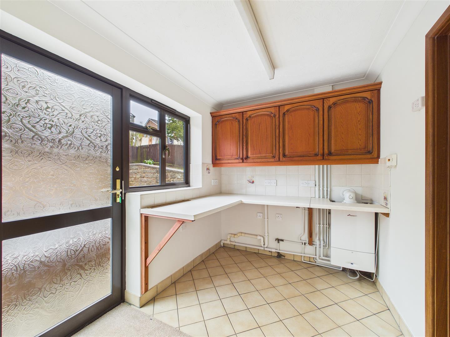 Utility Room - 2.01m x 2.69m (6'7 x 8'10) - Fitted laminate worktops with space and plumbing below for a washing machine and tumble dryer, fitted wall mounted units, wall mounted gas fired combi boiler, radiator, tiled flooring, door to garage and obscured door with window to side leading out to the rear garden.