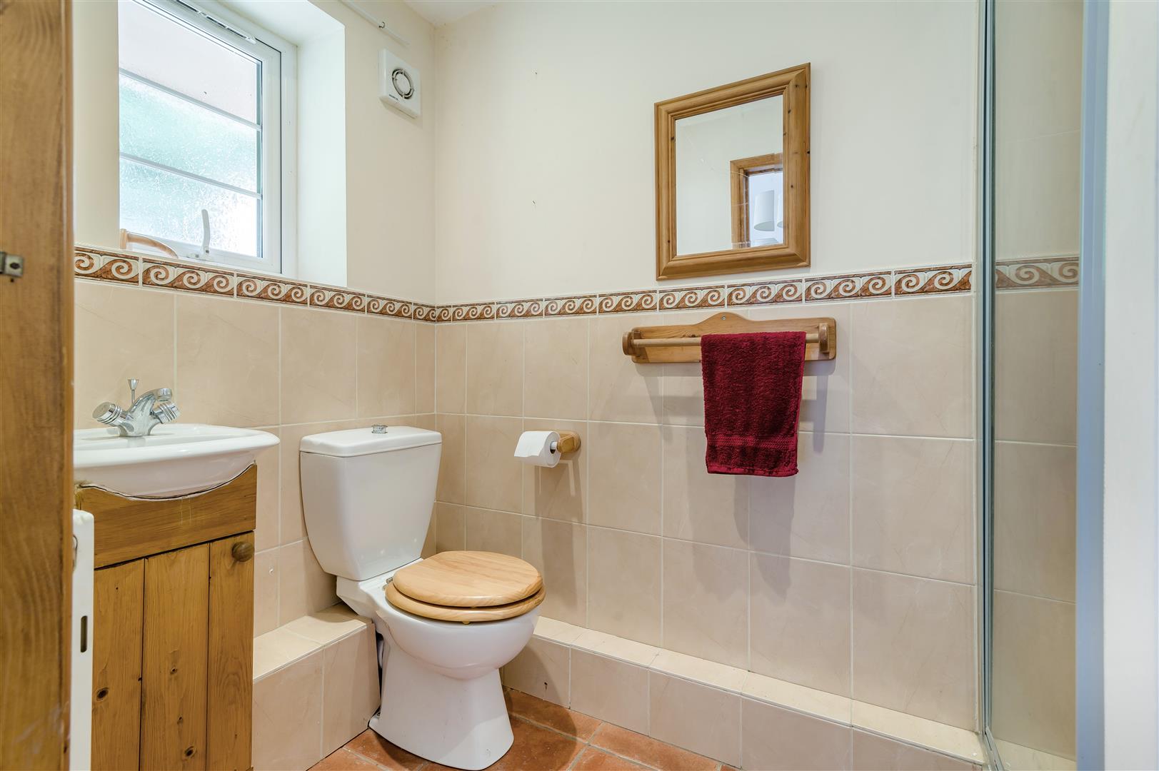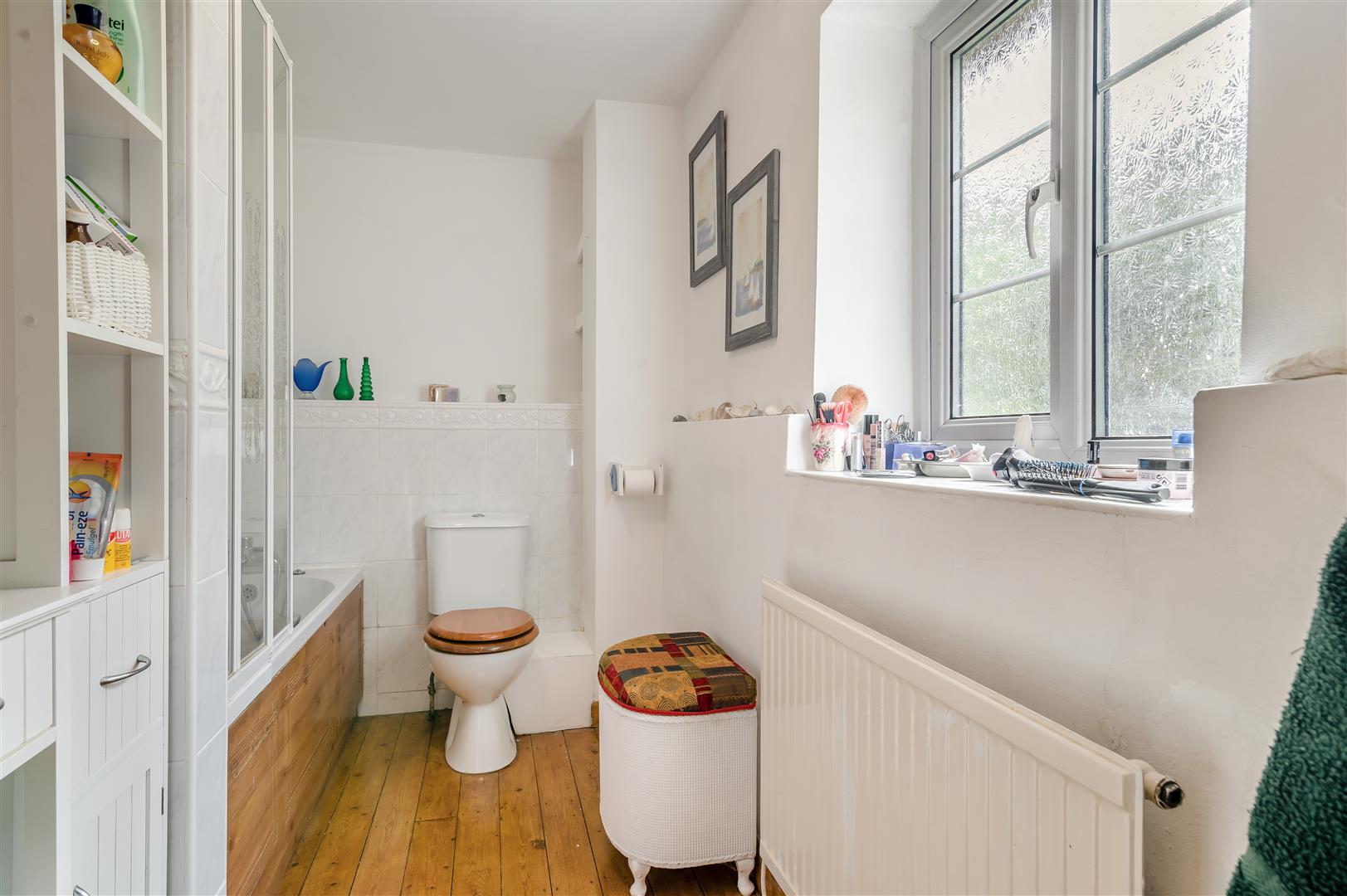 Bathroom - Comprising a bath with electric shower over, low level w.c, pedestal washbasin. Radiator, obscured rear aspect window.