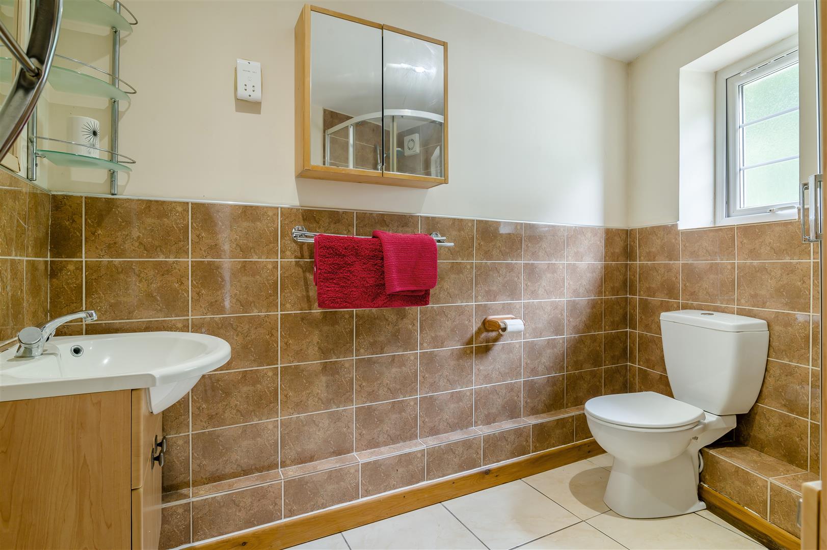 En-Suite W.C - Low level w.c, pedestal washbasin, extractor, part tiled walls.