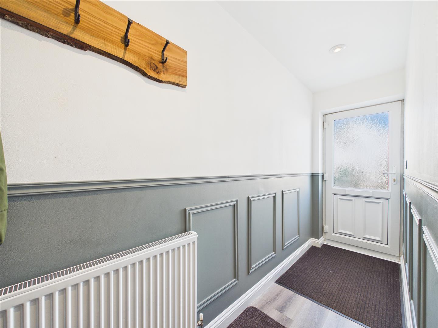 Entrance Hall - Ceiling spot lights, mains wired smoke alarm system, central heating thermostat controls, feature wall moldings, single radiator, wood effect laminate flooring, power points, solid timber door to:
