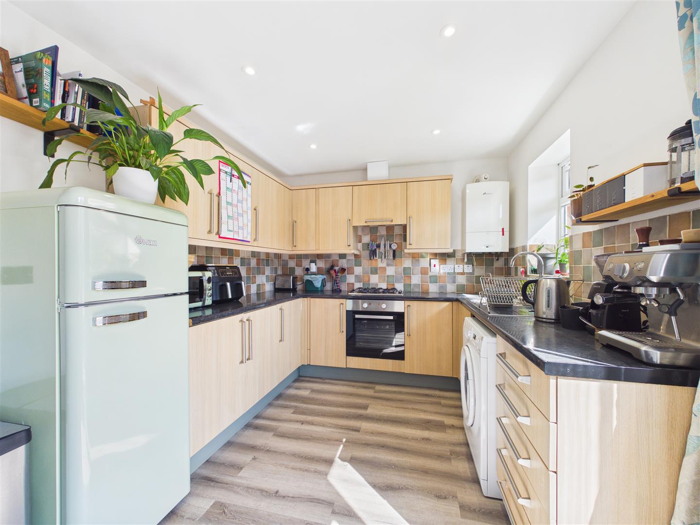 Open Plan Kitchen/Living Area - 5.64m x 2.72m (18'06 x 8'11 ) - Kitchen- Single bowl, single drainer stainless steel sink unit, mixer tap over, rolled edge worktops, range of base and wall mounted units, built-in electric oven, four- ring gas hob, wall mounted gas fired central heating and domestic hot water boiler, space for washing machine, space for freestanding fridge/freezer, power points, ceiling lights, continuation of the wood laminate flooring, rear aspect upvc double glazed window overlooking the rear garden with views towards forest and woodland.