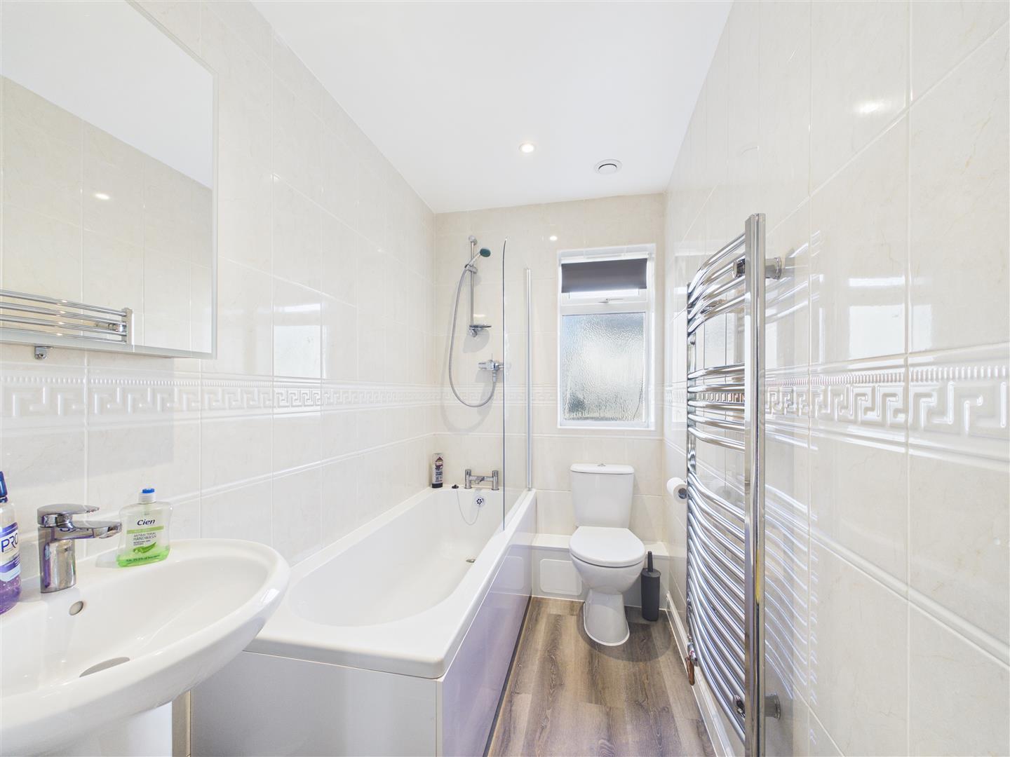 Bathroom - 1.42m x 2.31m (4'8 x 7'7) - White suite with modern side panel bath, mixer tap fitting over, mains fed shower, personal wash hand basin with monobloc mixer tap over, close coupled w.c, fully tiled, inset ceiling spots, extractor fan, continuation of the wood laminate flooring, heated towel radiator, front aspect upvc double glazed obscure window.