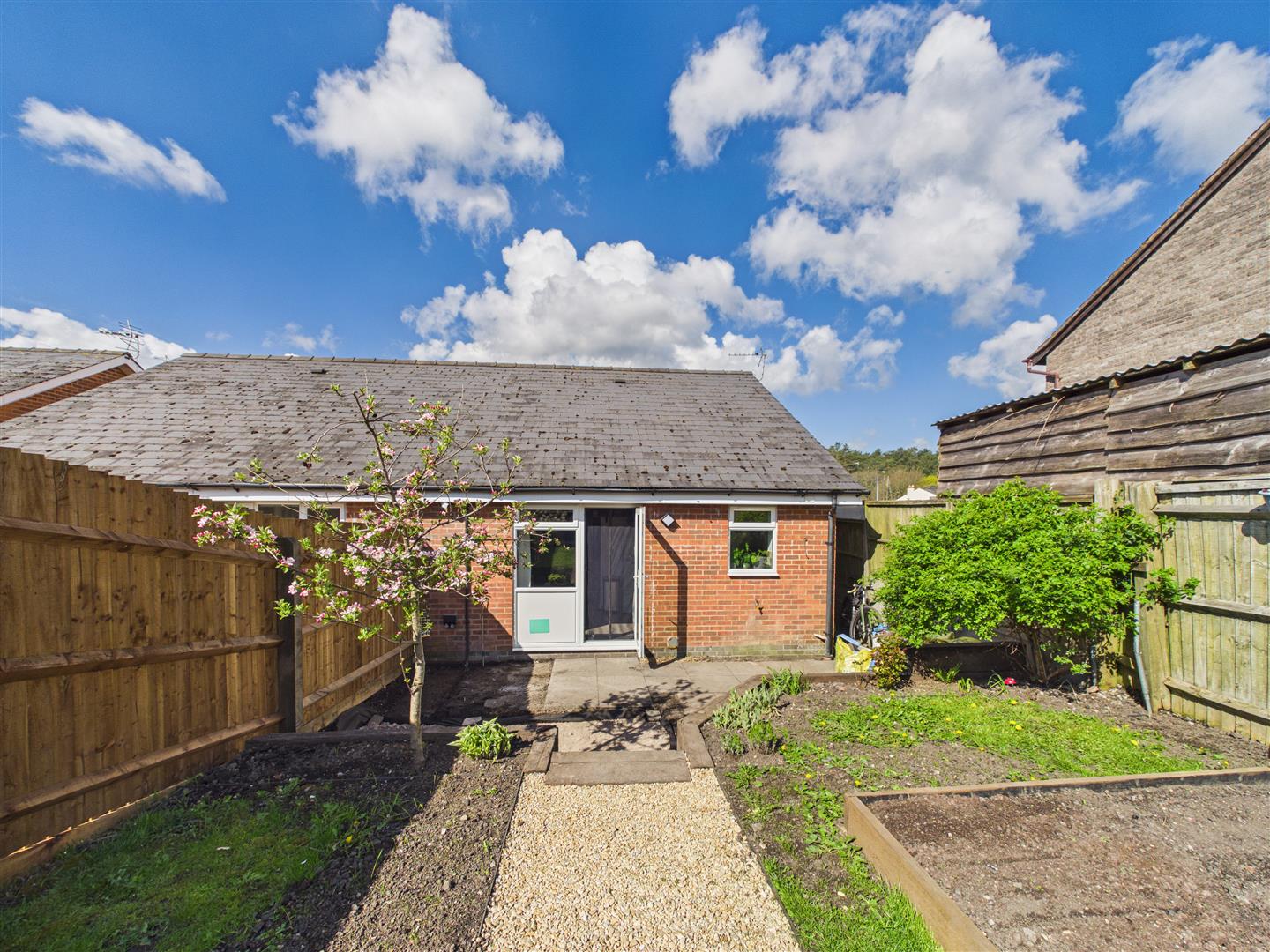 Outside - A paved pathway leads to the front of the property, where the front garden is laid to low-maintenance gravel with small shrubs and gated access to the rear garden.