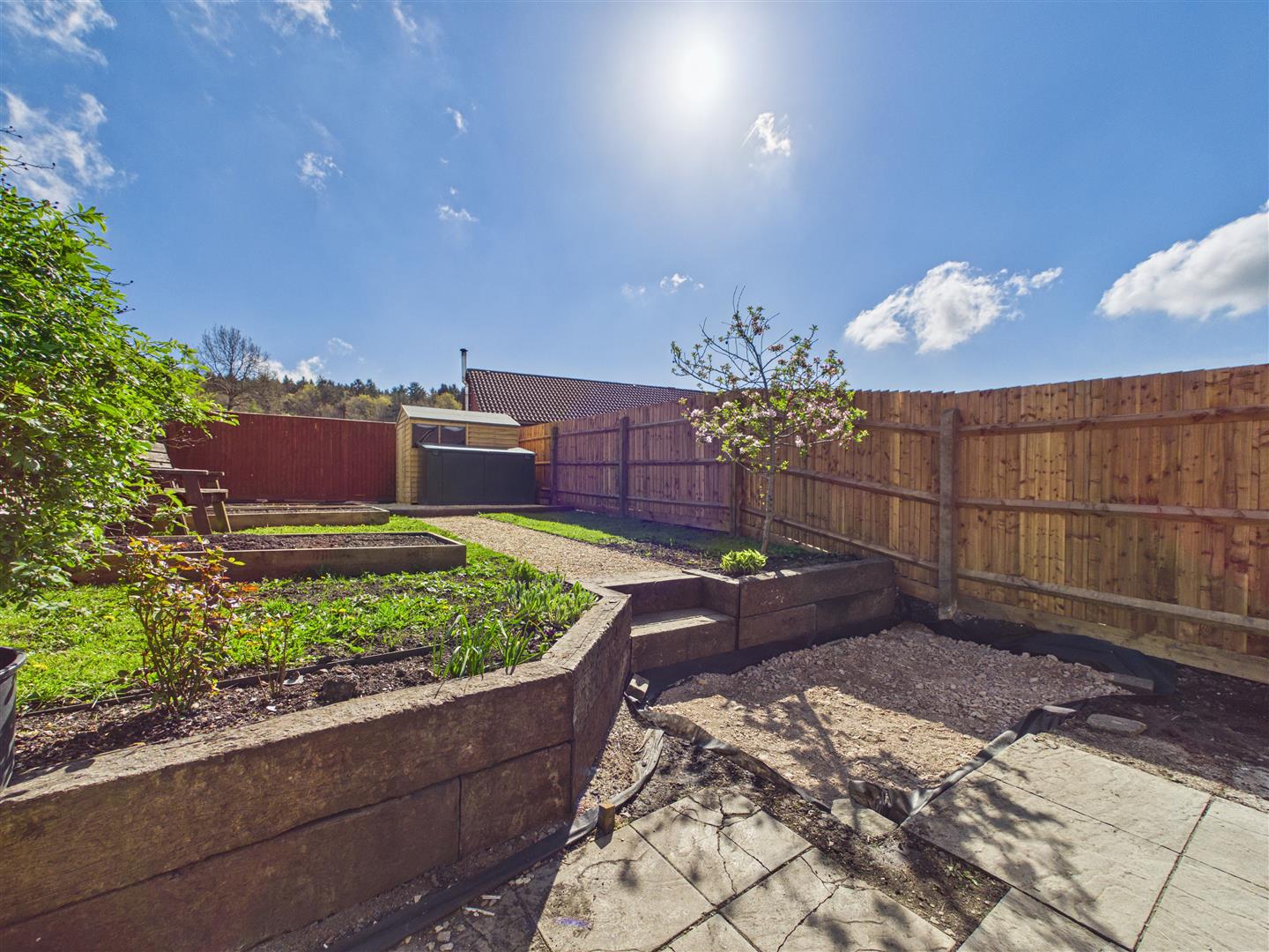 The rear garden has a paved pathway from the front garden, outside lighting, a patio seating area, and sleeper steps with beds leading to lawned areas. There is also a gravelled pathway, raised planters, further storage areas, a timber shed with power cable in situ, fencing, and uPVC fascias and guttering.
