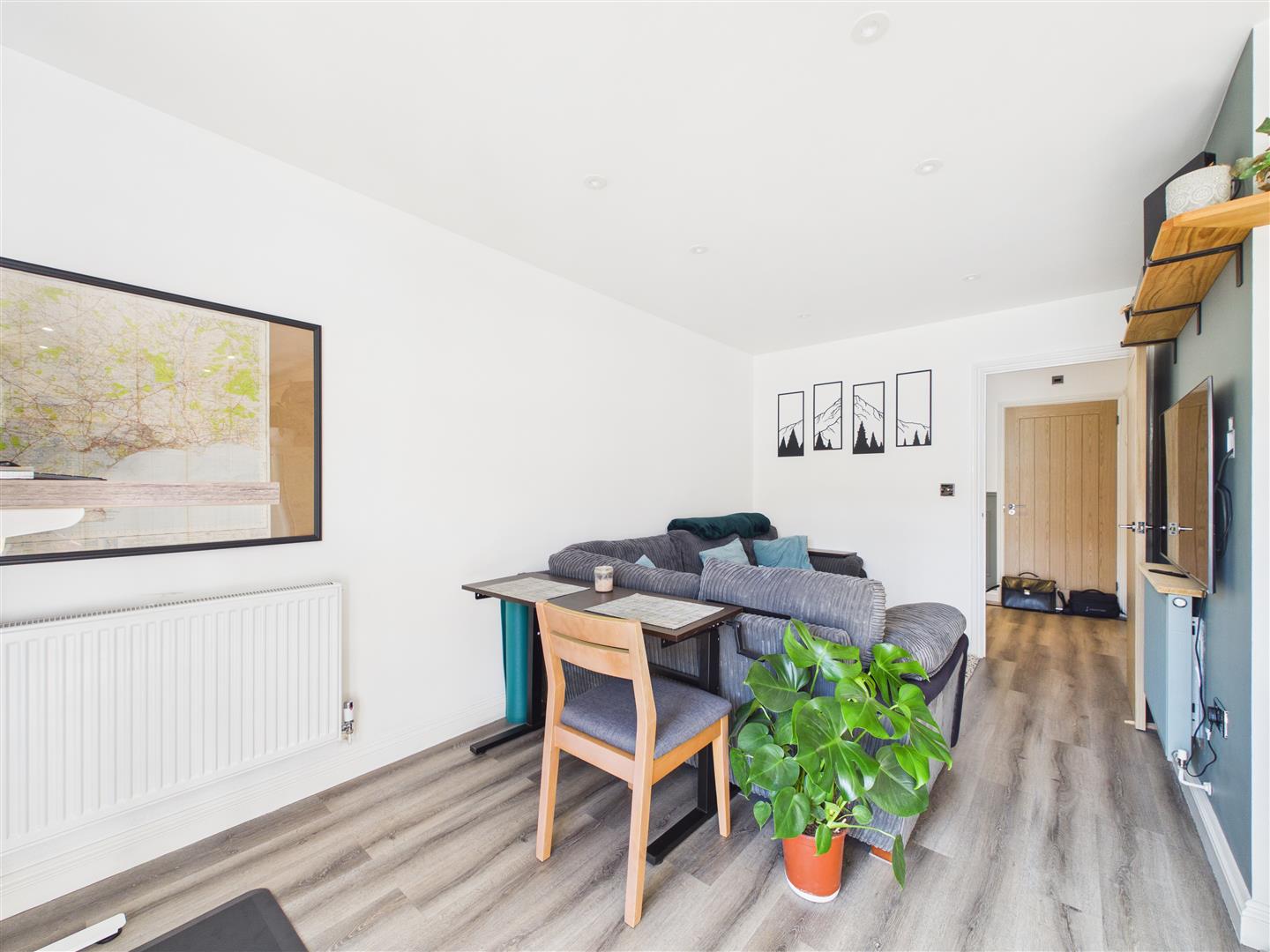 Living Area- Continuation of the ceiling spots, single radiator, power points, dimmer switch, door leading through to the hallway.