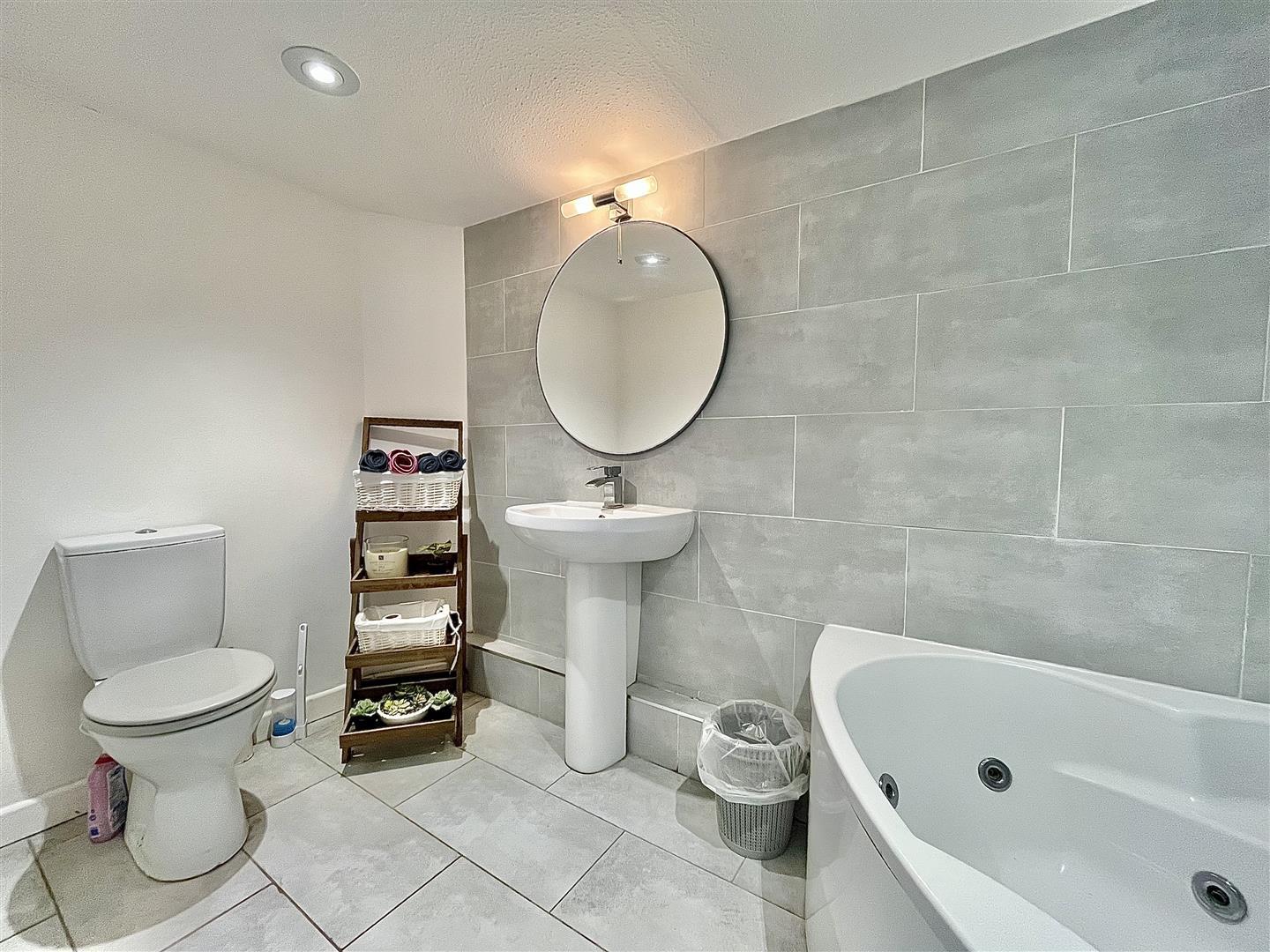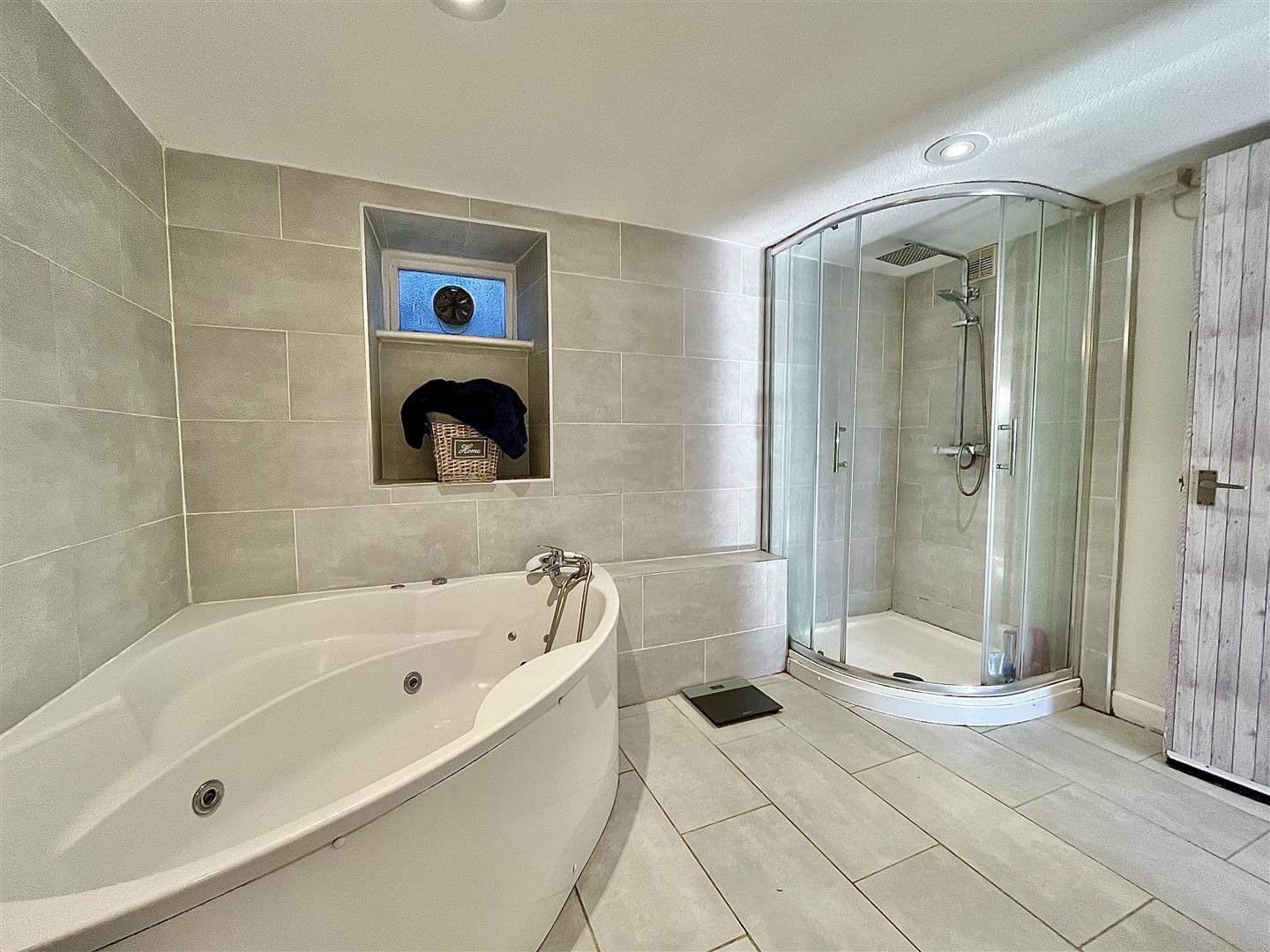 Bathroom - 3.18m x 3.12m (10'05 x 10'03) - Comprising a modern white four-piece suite that includes a large Jacuzzi bath, separate shower cubicle with mains fed rainfall shower, close coupled w.c and a pedestal washbasin. There are tiled walls and floor, a heated ladder towel rail and a small front aspect window.