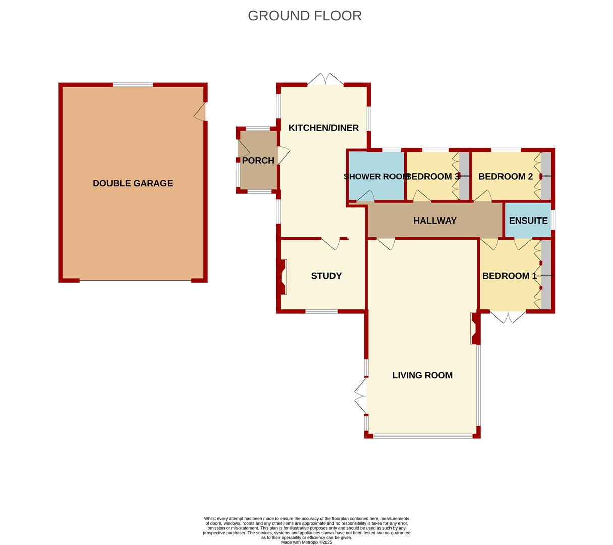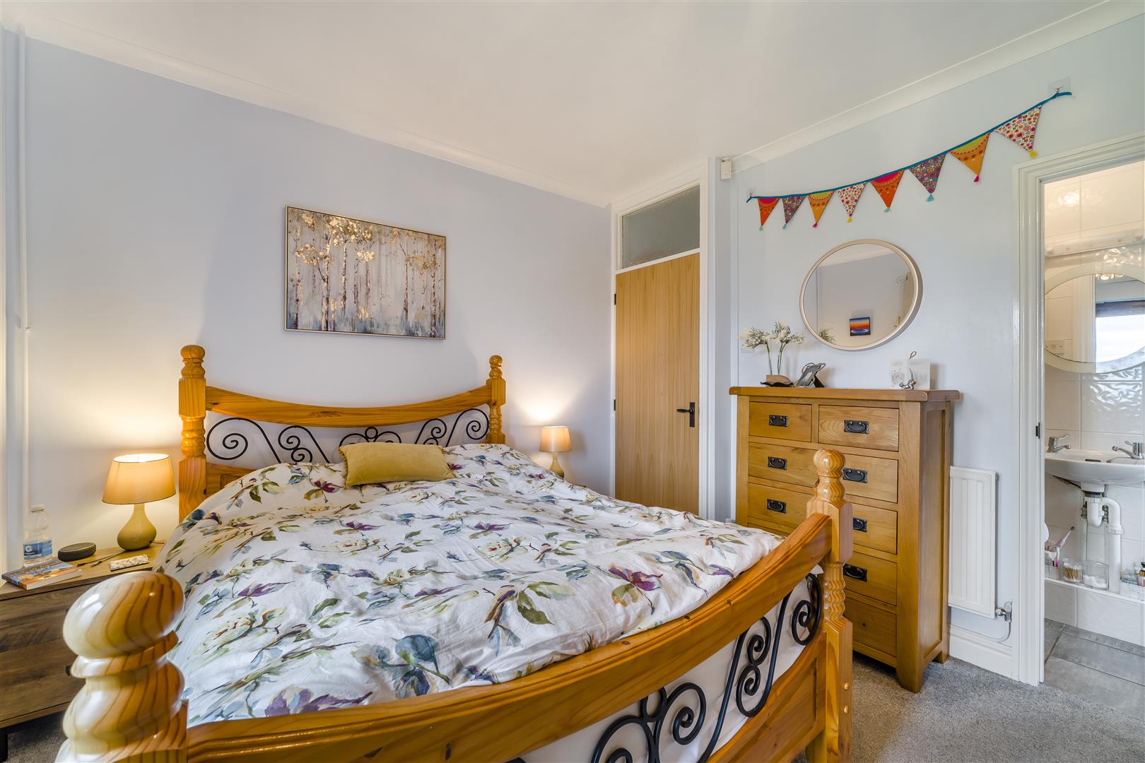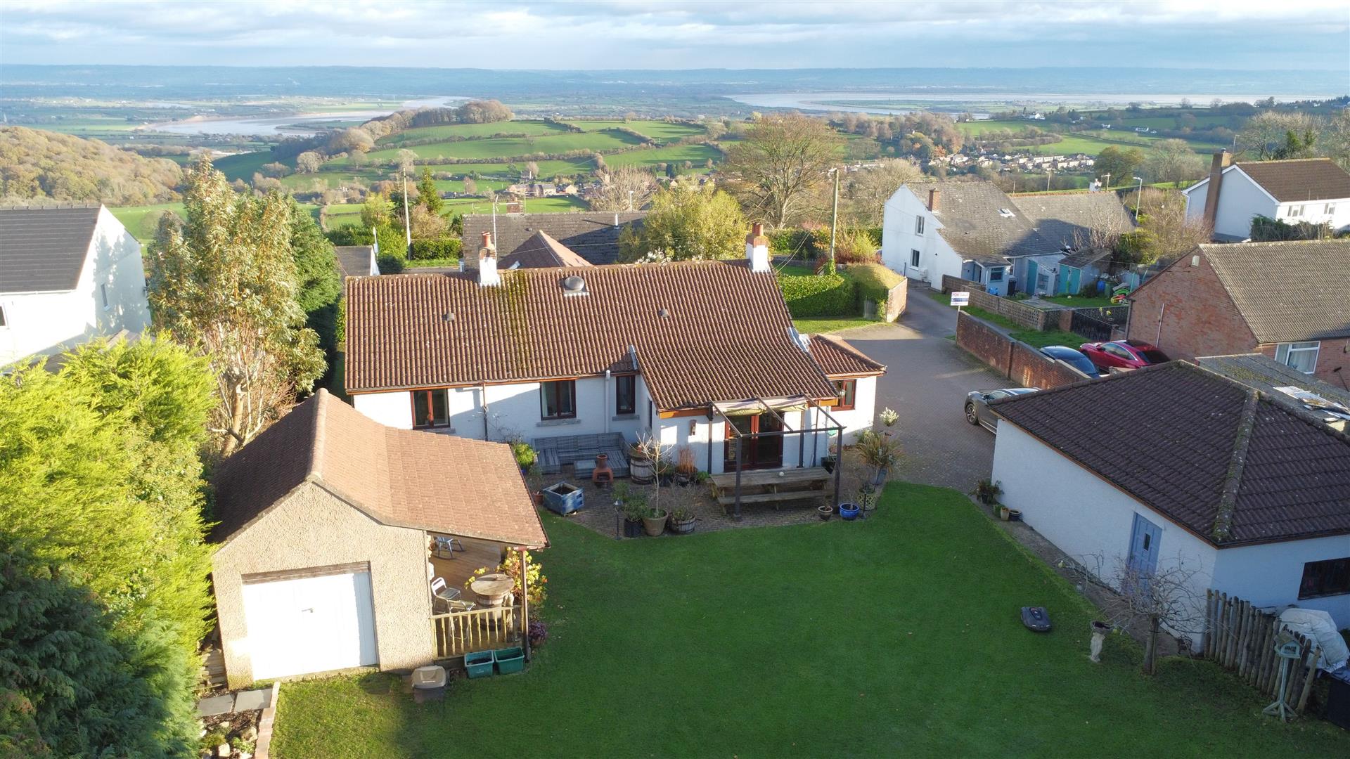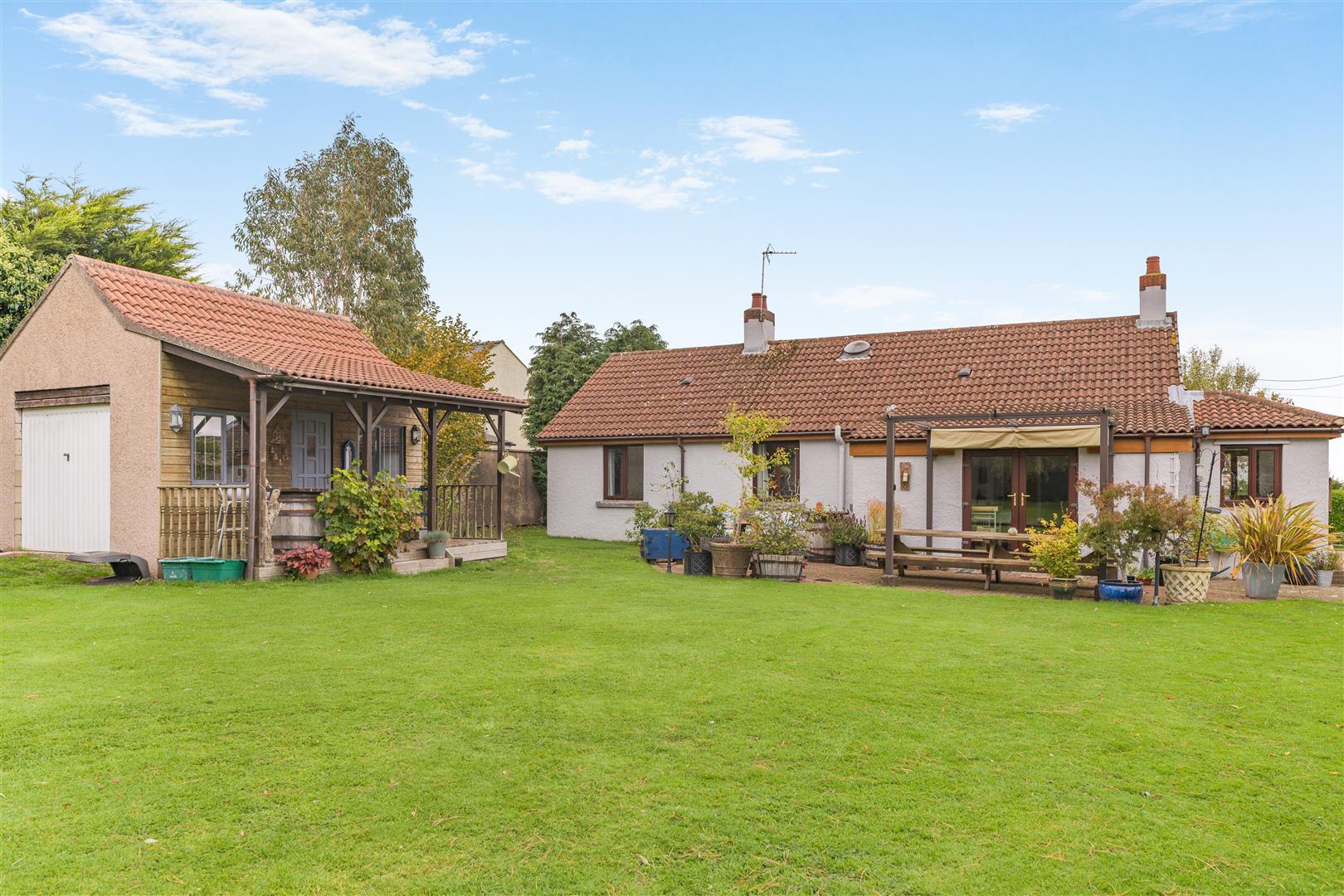 Outside - The property is accessed via a shared driveway with two neighbouring homes, leading to a spacious private block-paved drive and a detached double garage. Beautifully maintained lawns-kept immaculate by a robot mower included in the sale-surround the property on three sides. The west-facing rear garden enjoys abundant afternoon sun and features a variety of mature trees and shrubs, a patio area off the kitchen/diner perfect for al fresco dining, and a versatile workshop or studio equipped with an up-and-over door, power, and lighting.