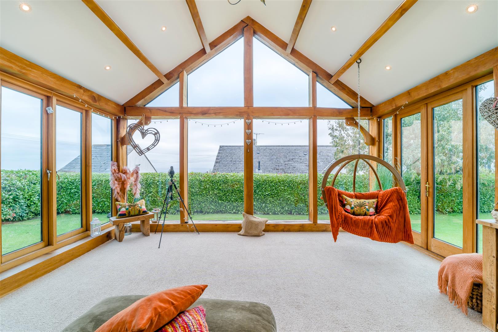 Living Room - 8.28m x 5.08m (27'02 x 16'08) - Having been tastefully extended by the current owners, a vaulted green oak extension with large picture windows maximises natural light and enhances the beautiful views of the River Severn and Cotswold escarpment in the distance, a gas fire neatly sits on a stone hearth, radiators, French doors lead out to the garden.